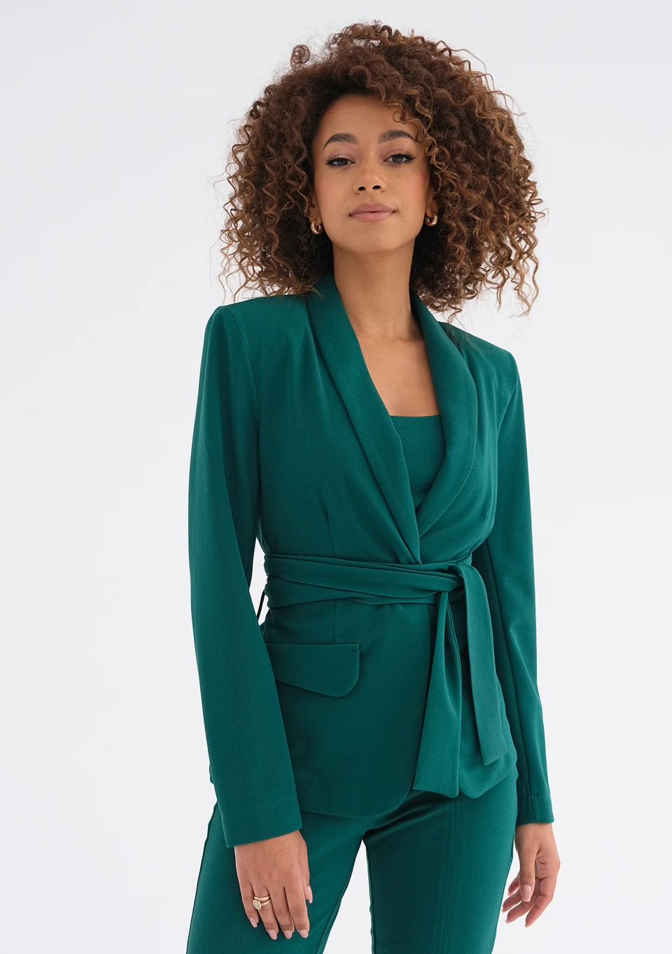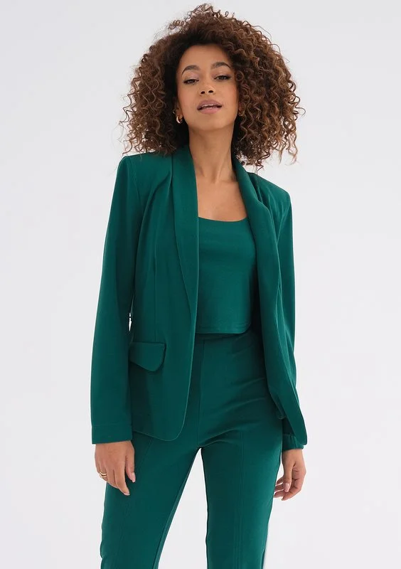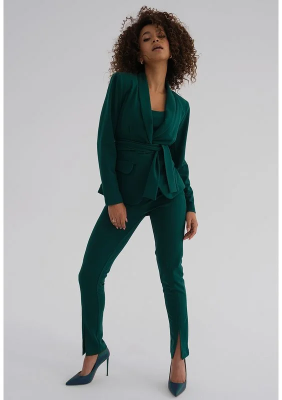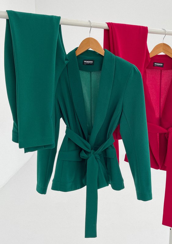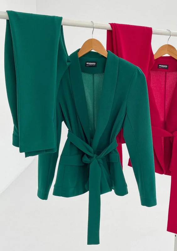 Zielona marynarka z eleganckim wiązaniem, które świetnie podkreśla wcięcie. Wyjątkowa pod względem koloru, idealnie odmieni szykowne stylizacje do pracy, na spotkania i uroczystości.