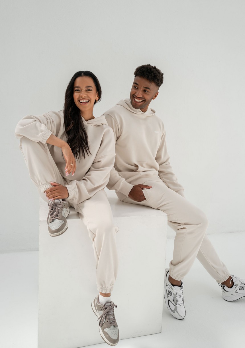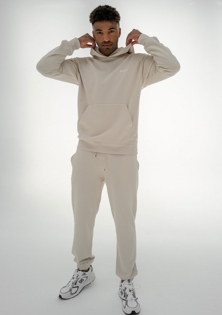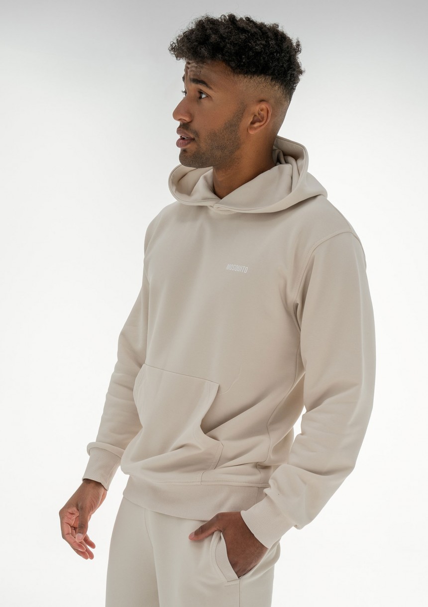 Wygodna bluza męska z kapturem i kieszenią, wykończona ściągaczami. Zapewnia niezrównany komfort noszenia przez cały dzień. Wykonana w kokosowym kolorze.