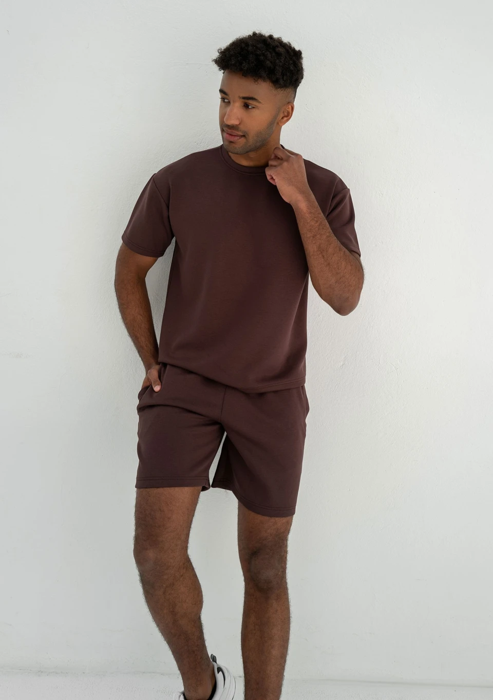 Wygodne i wszechstronne szorty męskie z miękkiej w dotyku dzianiny soft z wiskozą. Wykonane w brązowym kolorze.