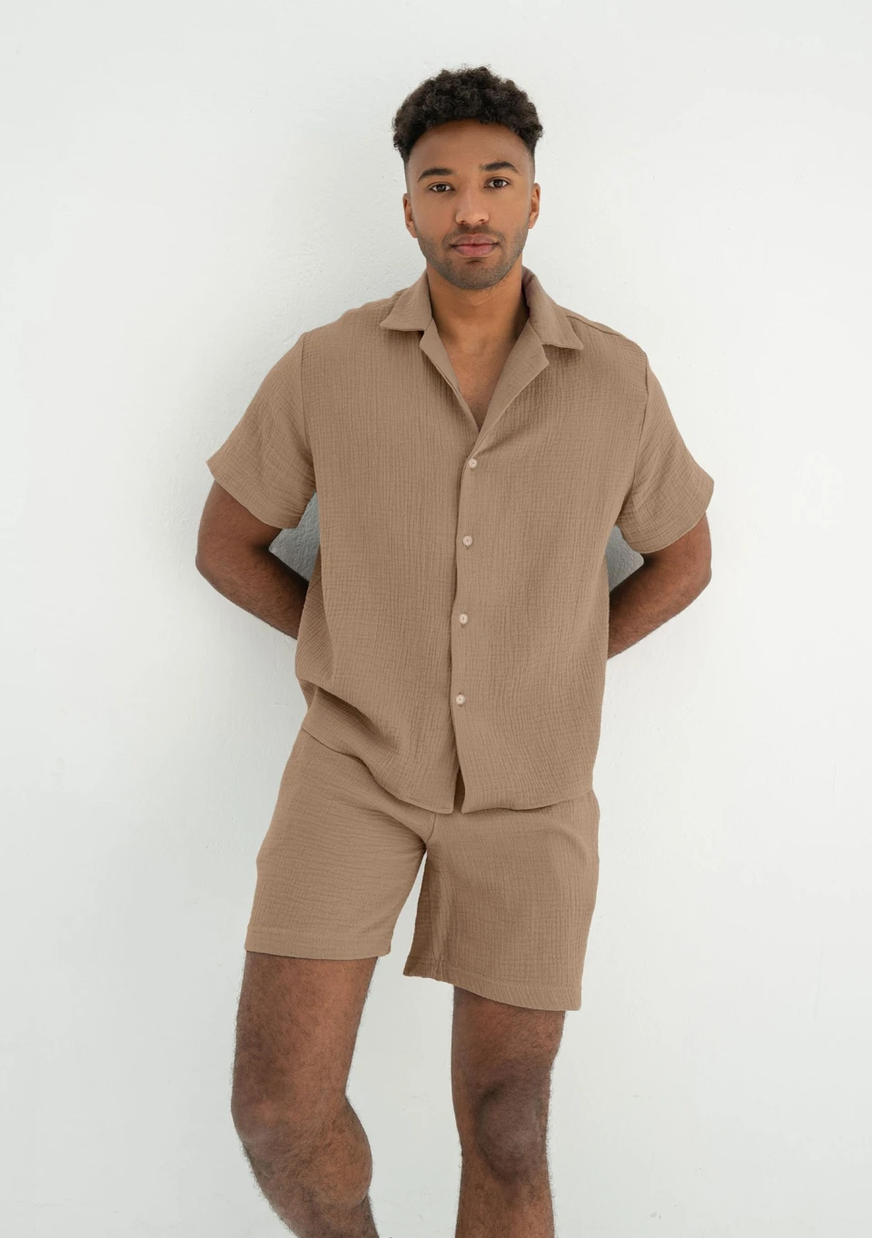 Beżowe szorty męskie z muślinu wysokiej jakości. Gwarantują lekkość, przewiew i przyjemność noszenia w upalne dni, idealne na wakacje.
