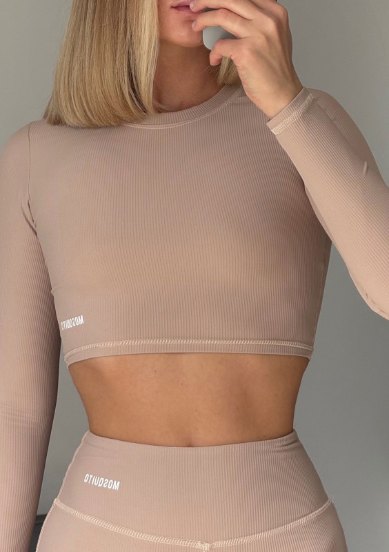 Wygodny top damski w beżowym kolorze, uszyty z wygodnej tkaniny w prążki. Idealny do każdego treningu. Model o kroju crop, z długim rękawem.