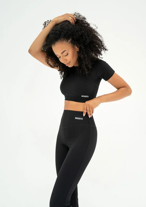 Czarny top damski o wszechstronnym, treningowym przeznaczeniu. Wykonany z wygodnej, prążkowanej tkaniny, sygnowany logiem Mosquito.