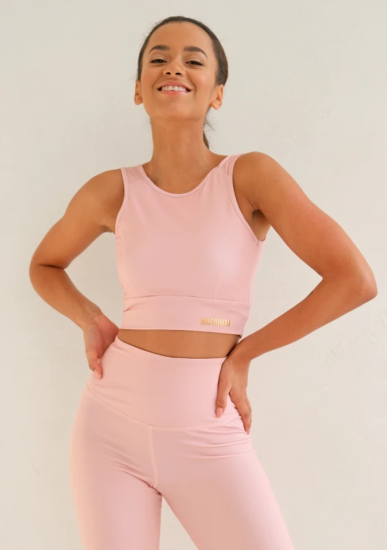 Damski top sportowy w pudrowym odcieniu z efektownym wycięciem na plecach. Model posiada zabudowany, bardzo wygodny fason. Wykonany z elastycznej i odparowującej tkaniny. Sprawdzi się na każdym rodzaju treningu.
