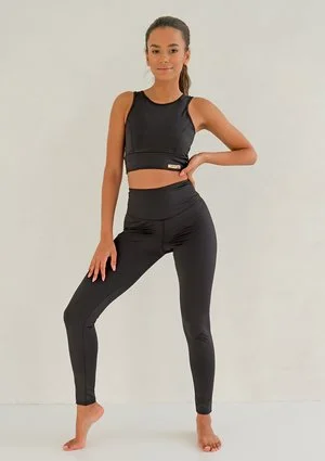 Czarny, damski top sportowy o krótkim kroju i bez rękawów to pomysł na klasyczny i uniwersalny look na trening. Nie jest to zwyczajna bluzka sportowa – na plecach znajduje się intrygujące, geometryczne wycięcie, które wizualnie dodaje sportowego stylu oraz zapewnia przyjemną wentylację. Długość czarnego topu sięga do talii, w ten sposób stworzy gustowne połączenie ze sportowymi legginsami z wyższym stanem lub spodenkami w typie bikerów. Czarny top damski z wycięciem na plecach odsłania ramiona i dolne partie brzucha, co jest równoważone przez zabudowany dekolt. Przód bluzki ozdabiają równolegle biegnące szwy. Czerń damskiego topu do ćwiczeń pasuje do każdego koloru spodni i szortów. Złote logo marki zdobi z przodu dolny pas topu.