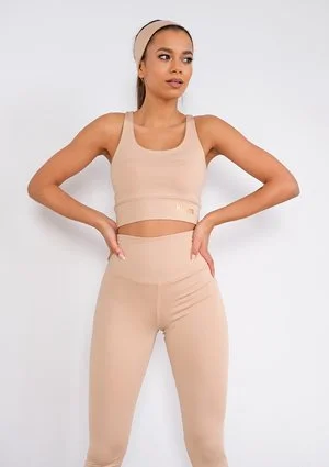 Beżowy, krótki top damski do ćwiczeń, o pomysłowym kroju ramiączek w formie przeplatających się na plecach, cienkich pasków skradnie Ci serce już na pierwszym treningu. Produkt stanowi świetną alternatywę dla zwykłych bokserek i luźnych T-shirtów – jest jednak o wiele bardziej gustowny i zmysłowy. Top estetycznie i gładko opina sylwetkę, eksponując ramiona, barki i łopatki. Krótki krój został zaprojektowany z myślą o genialnym zestawieniu topu z legginsami o wyższym pasie. Beżowy, damski top sportowy jest szyty z elastycznego, wytrzymałego włókna poliestrowego z dodatkiem elastanu. Materiał odprowadza nadmiar ciepła i odparowuje wilgoć, byś czuła pełen komfort i świeżość, nawet podczas sporego wysiłku.