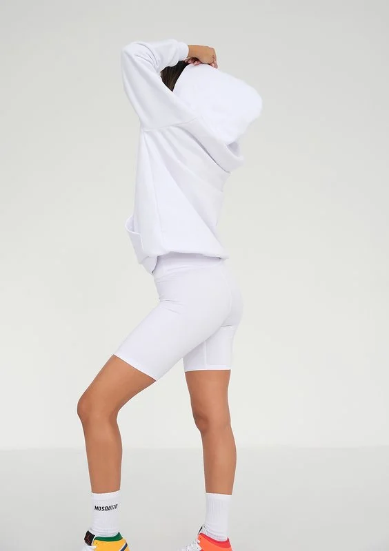 Białe legginsy bikery to lekki i wygodny fason na trening, a także baza najmodniejszych stylizacji z bluzami oversize. Model z wyższym pasem, gładko dopasowujący się do sylwetki.