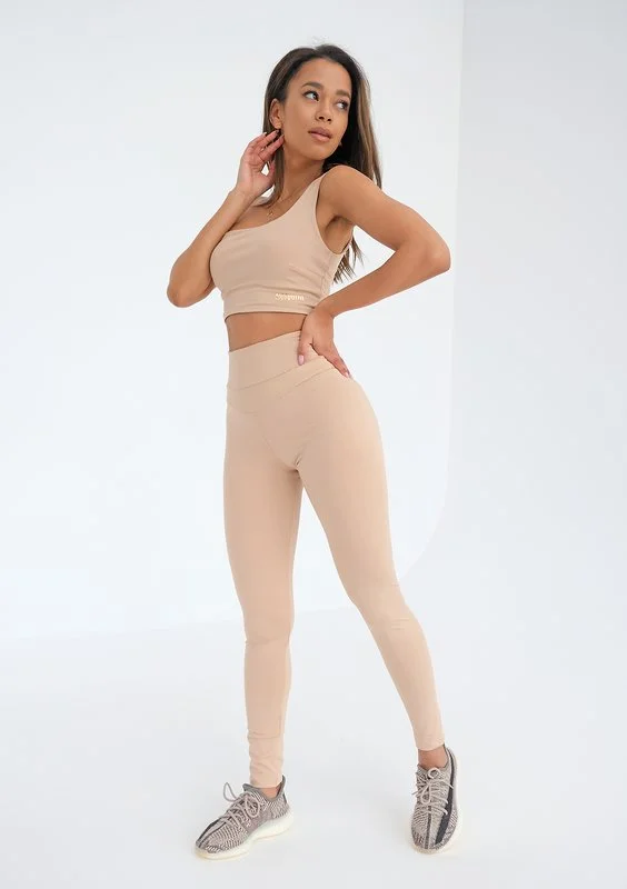 Zmysłowy top z asymetrią, o sportowym zastosowaniu. Sprawdzi się podczas jogi i spokojnych ćwiczeń na macie. Model szyty z gładkiej, elastycznej tkaniny w jasnym odcieniu beżowym. Gustownie podkreślony złotym, mieniącym się logiem.