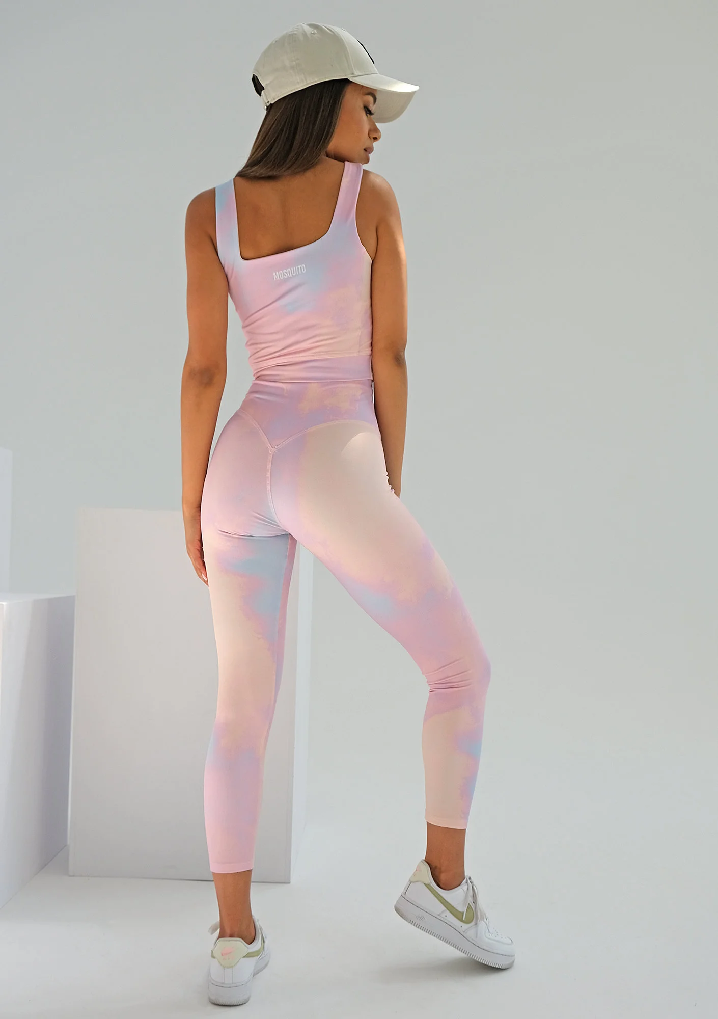 Krótki top damski to śliczny model sportowy, starannie wykonany z wielobarwnej tkaniny. Połączenie jasnych, pastelowych odcieni w formie plam tie dye tworzy bajeczną kompozycję, która nie szybko Ci się znudzi, a wręcz mocno zachęci do częstego ubierania na trening. Ten krótki, damski top sportowy ma prosty fason, sięgający talii i efektowny, kwadratowy dekolt. Podwójny materiał gładko przylega do ciała, pięknie modelując sylwetkę. Top jest bardzo elastyczny i dobrze utrzymuje biust, nawet w większym rozmiarze. Tkanina jest sprężysta, rozciągliwa i bardzo wygodna. Włókna nie chłoną wilgoci, dlatego nie musisz martwić się o plamy od potu, które pojawiają się podczas wysiłku. Pastelowy top damski jest pięknie ozdobiony białym logotypem Mosquito, który znajduje się z tyłu ubrania.