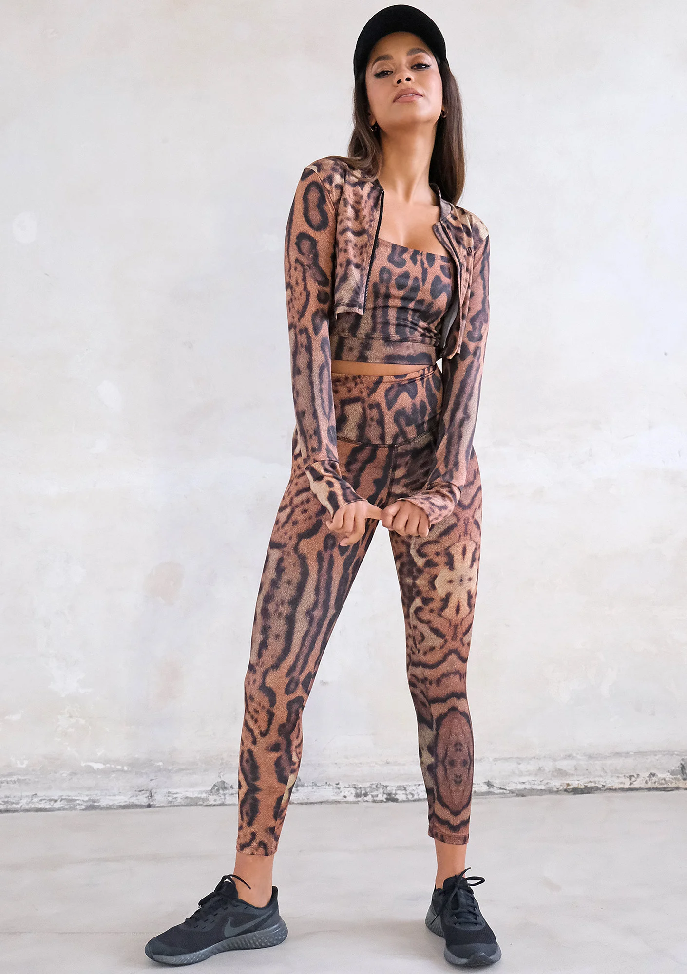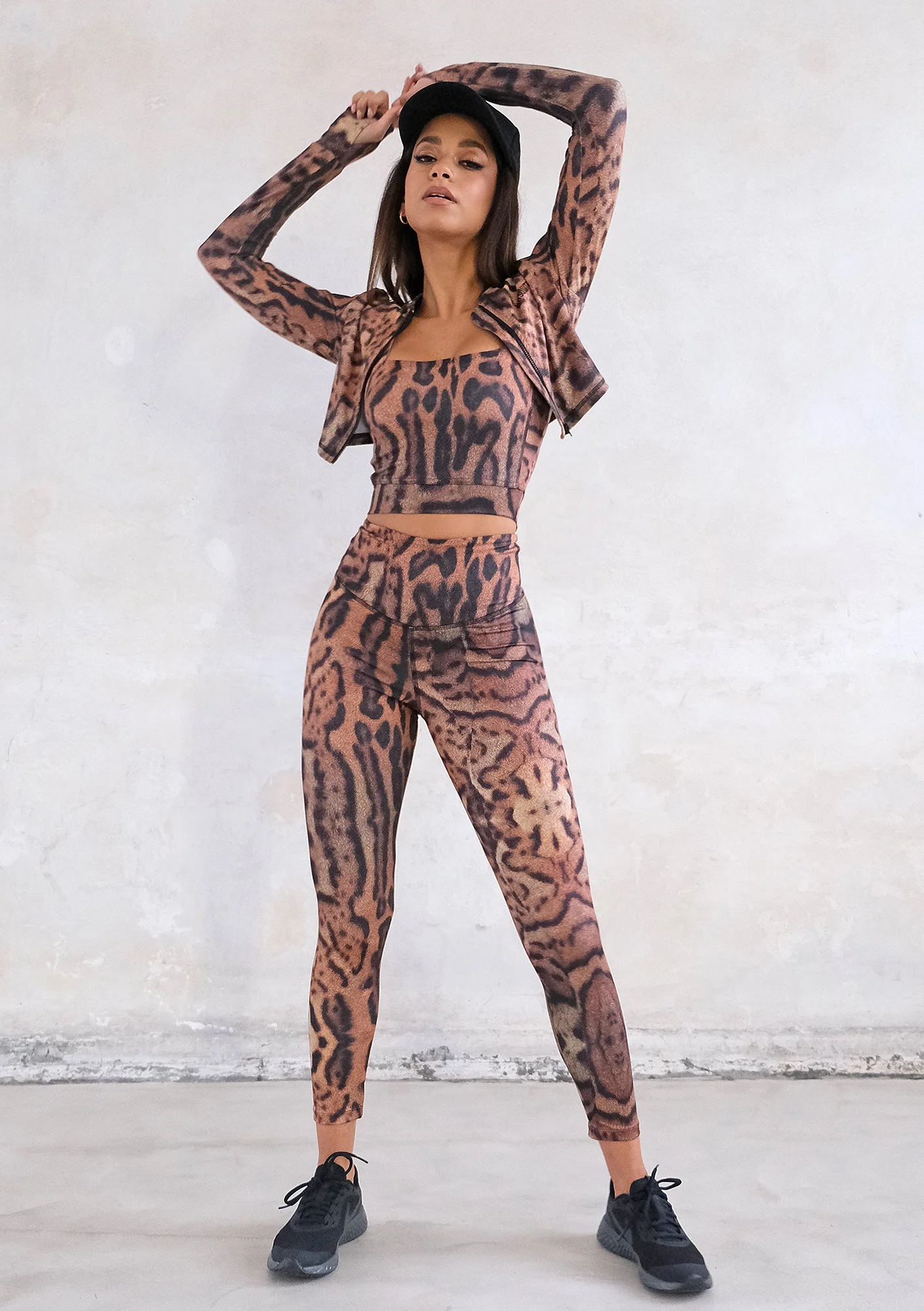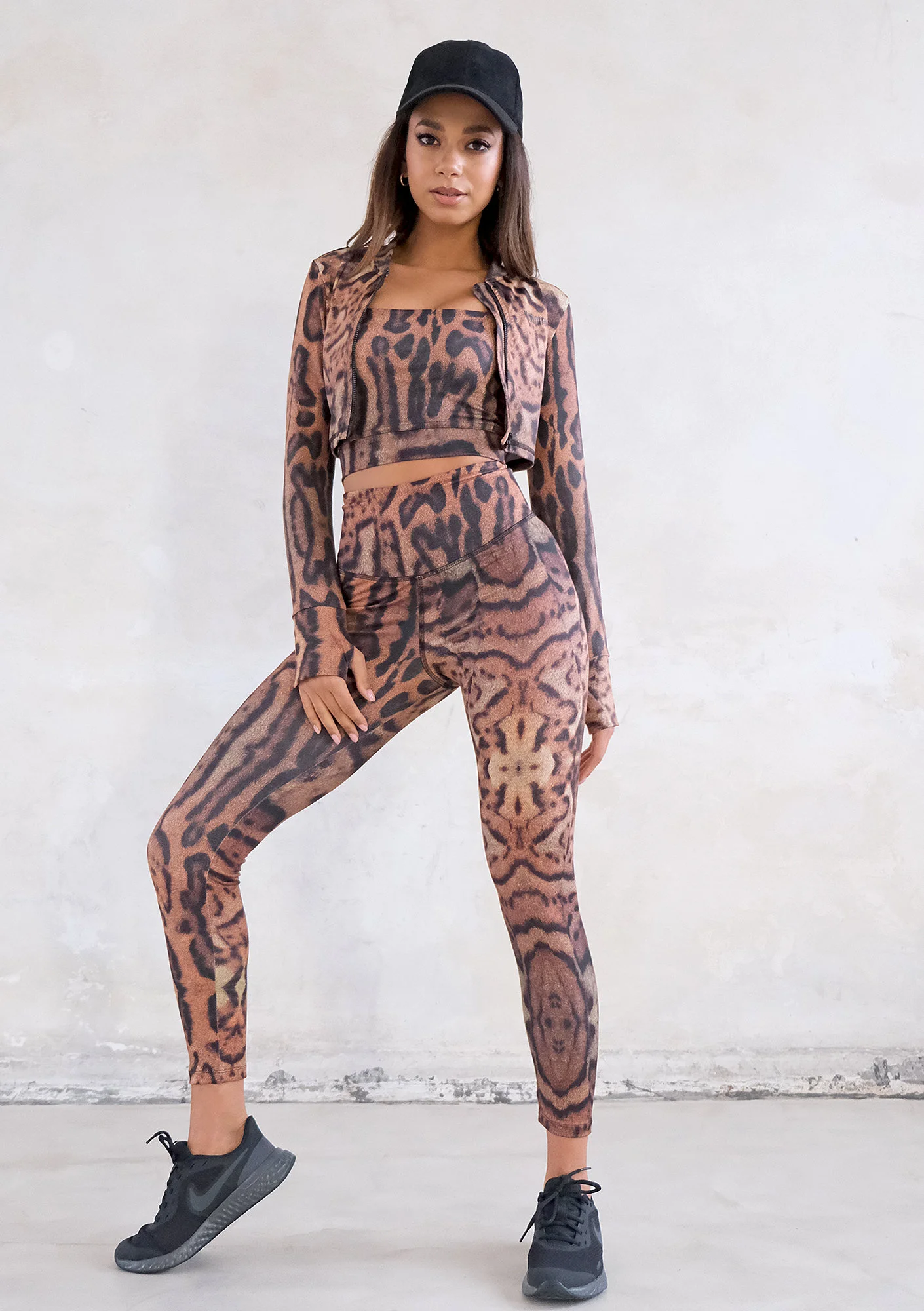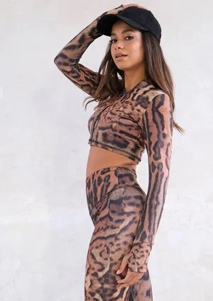 Bluza jest zapinana z przodu na zamek, który jest wykonany w czarnym kolorze, podobnie jak stylowe logo naszej marki ozdabiające ubranie. Fason jest dopasowany, dzięki elastycznemu materiałowi. Bluza gwarantuje znakomity przewiew w czasie treningu, włókna odparowują wilgoć i szybko schną. Wzór cętek dzikich kotów możesz łączyć z legginsami z tego samego modelu, ale równie stylowo bluza zaprezentuje się z innymi, gładkimi kolorami: brązem, czernią i zielenią. Tabela rozmiarów odnosi się do obwodów sylwetki, a nie wymiarów bluzy, dlatego przy wyborze zmierz swój biust i talię, a następnie porównaj z podanymi wartościami. Ubrania z kolekcji sportowej Mosquito Move to produkty dostępne w czterech rozmiarach: XS, S, M i L.
