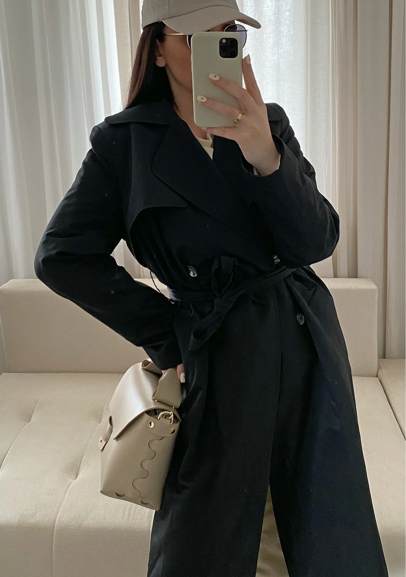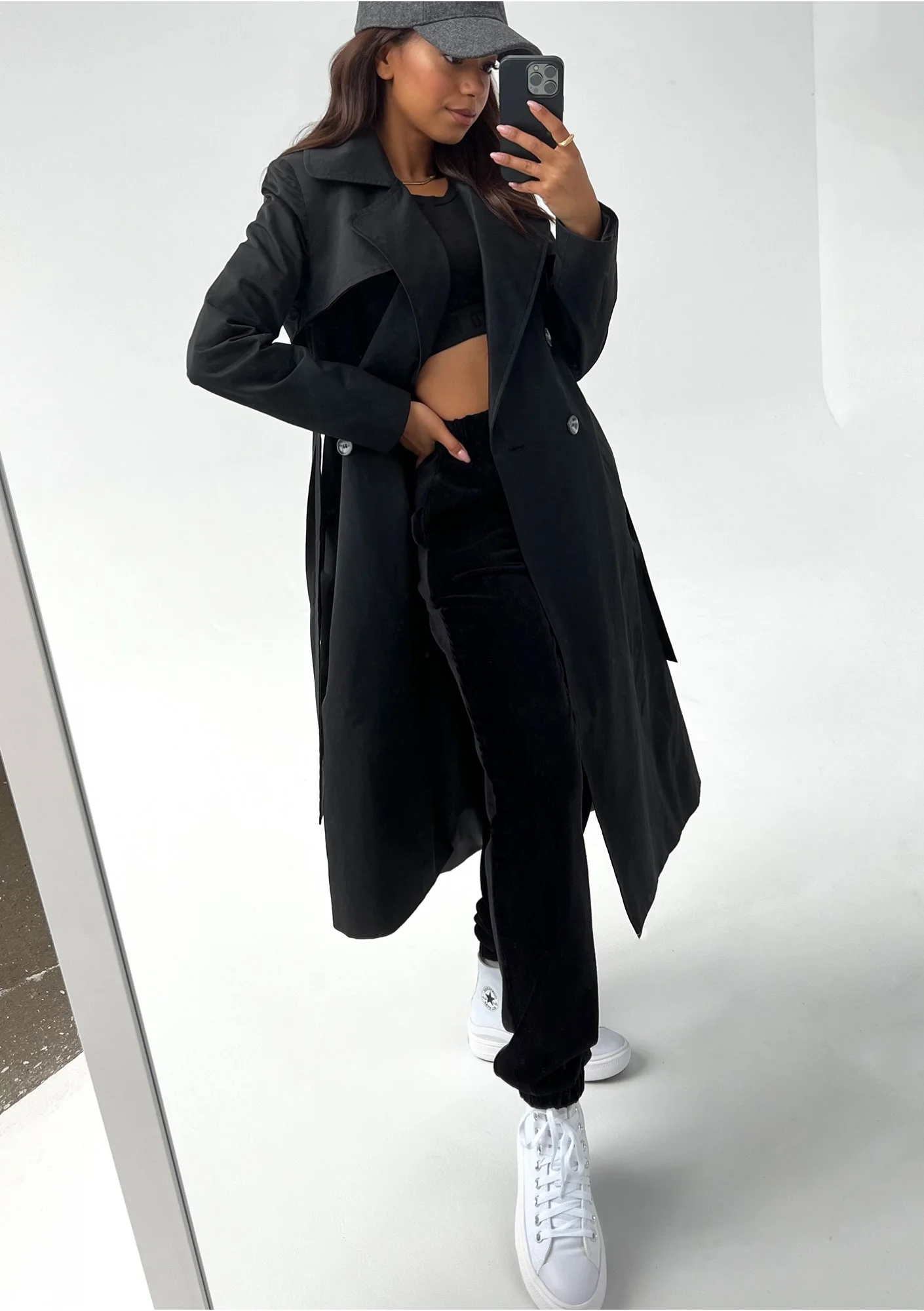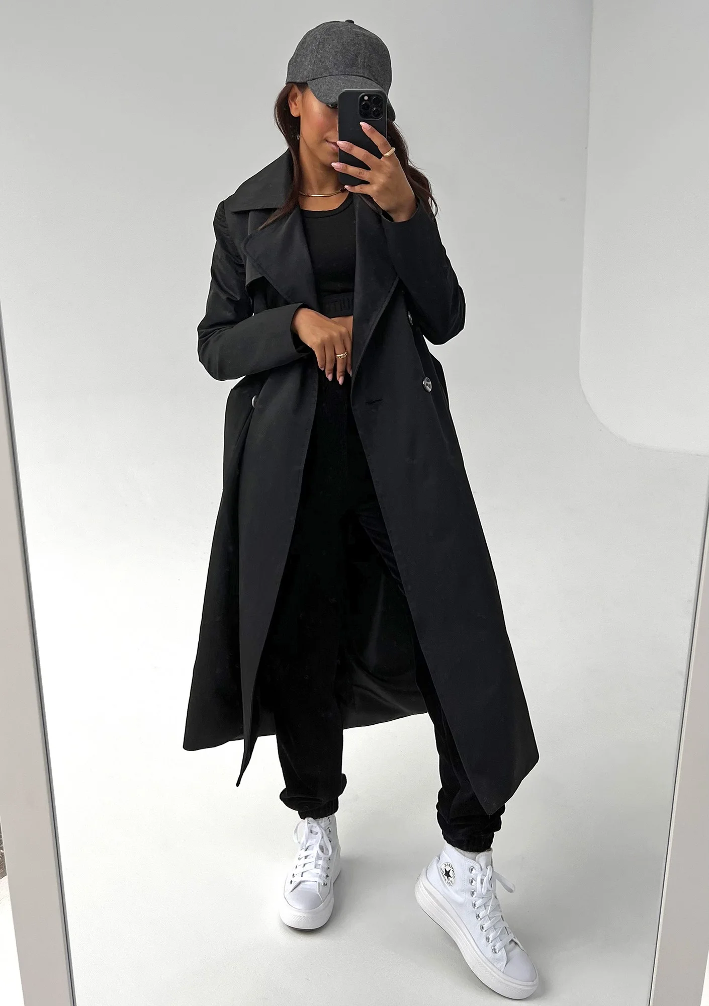 Czarny trencz damski o lekkiej formie z otwartymi klapami. Takie płaszcze damskie nosimy głównie wczesną wiosną, jako okrycie do casualowych i eleganckich stylizacji. Model Coty z naszej kolekcji stworzy ciekawe połączenie nawet ze sportowym dresem.