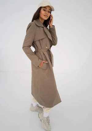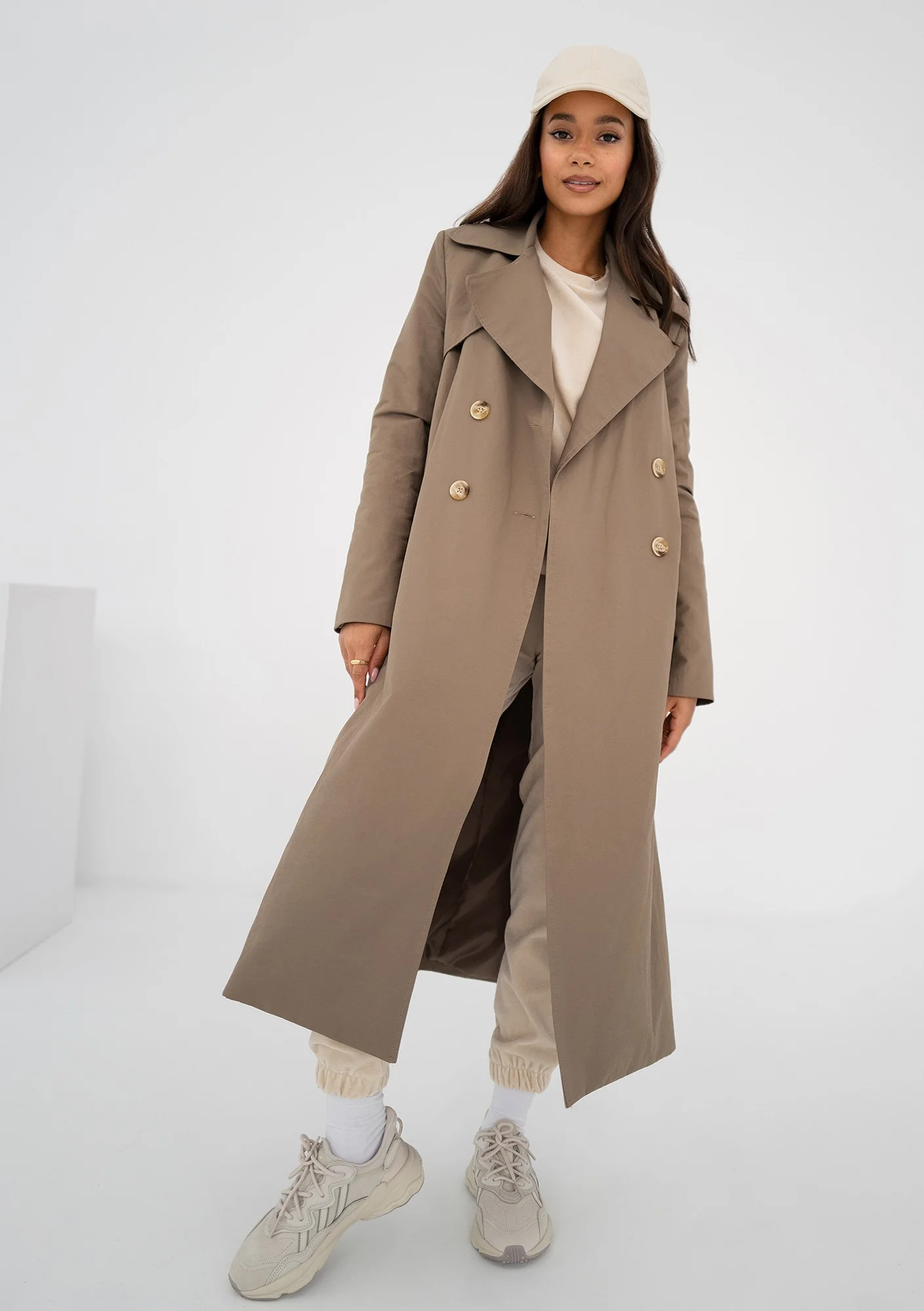 Najmodniejsze elementy kroju Coty zapewnią udany i zwracający uwagę look. Stylu dodaje klapa przechodząca spod jednego ramienia na cały tył. Prochowiec jest zapinany szylkretowymi guzikami, co nadaje drobnego, retro akcentu. Do produktu dołączony jest pasek do zawiązania wokół talii. Ten dwurzędowy płaszcz damski wiosenny wyposażyliśmy w kieszenie. Sięga za kolano, a więc pasuje także do sukienek i długich spódnic. Model wykonaliśmy w eleganckim i uniwersalnym, kawowym beżu. Dostępne rozmiary to XS, S, M oraz L. Kolekcja wiosenna 2023 obejmuje model Coty również w czarnym kolorze.