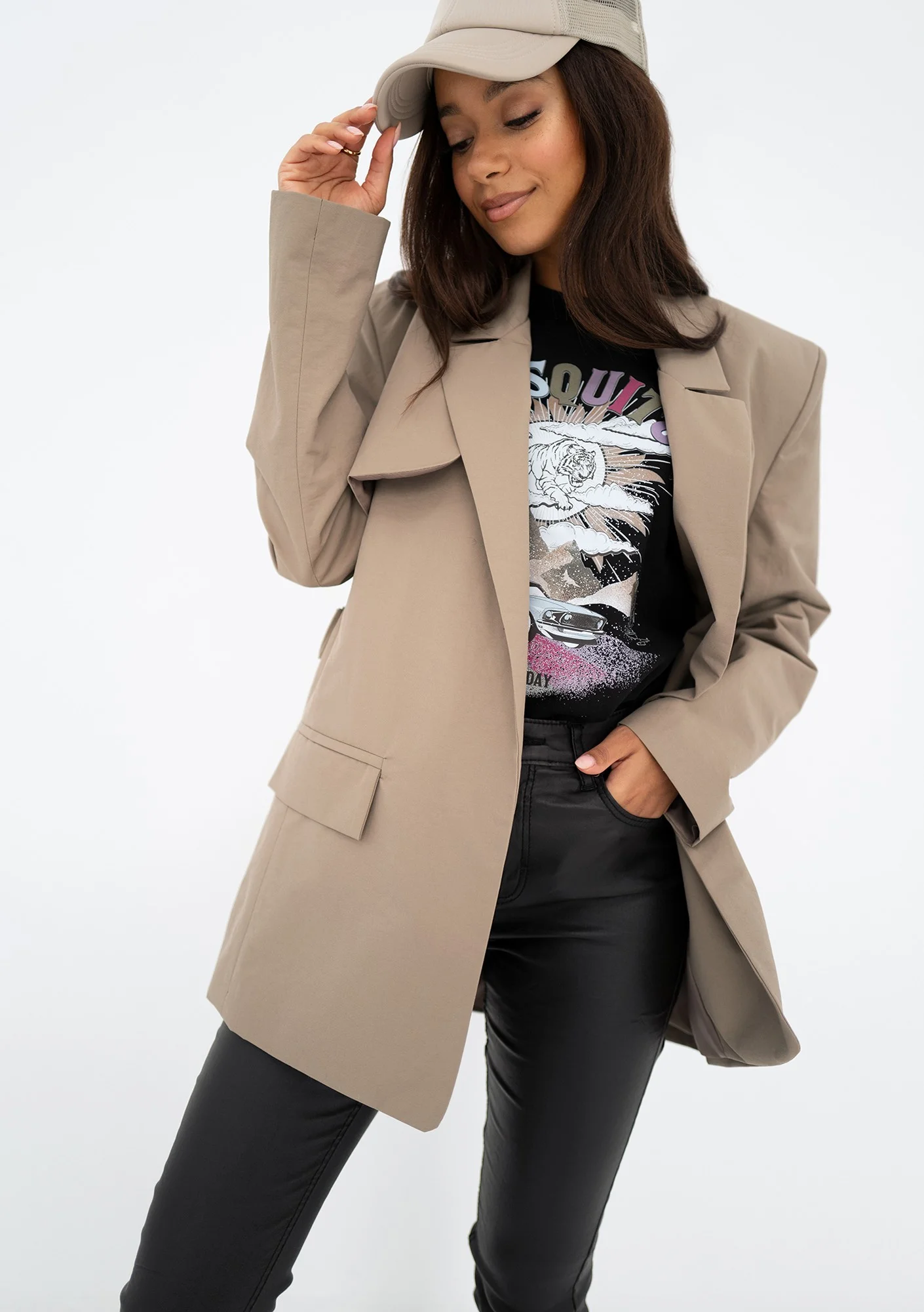 Beżowy płaszcz damski o lekkiej i krótkiej formie z otwartą klapą jest najmodniejszym, wiosennym fasonem. Łączy w sobie cechy marynarki i lekkiego trencza. To model z efektownym paskiem z klamrą.
