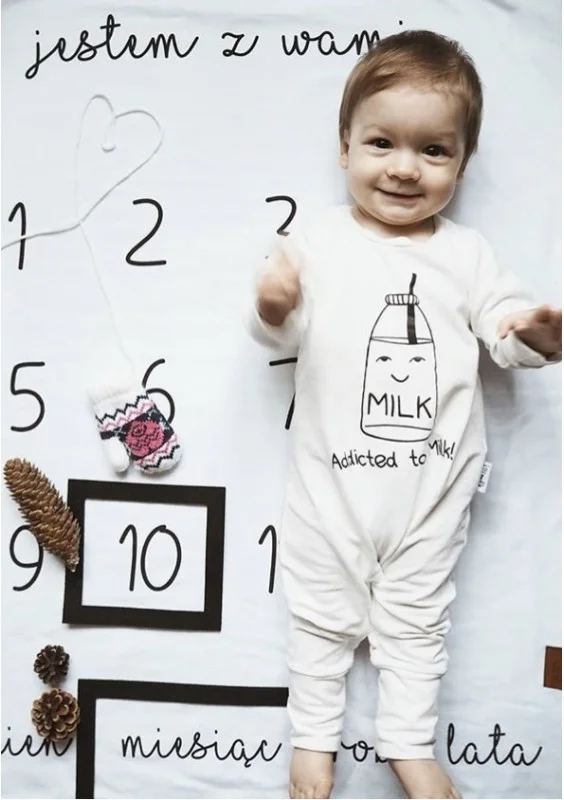Biały romper dziecięcy z zabawnym napisem dla małych amatorów mleka. Ubranko bawełniane rodzimej produkcji.