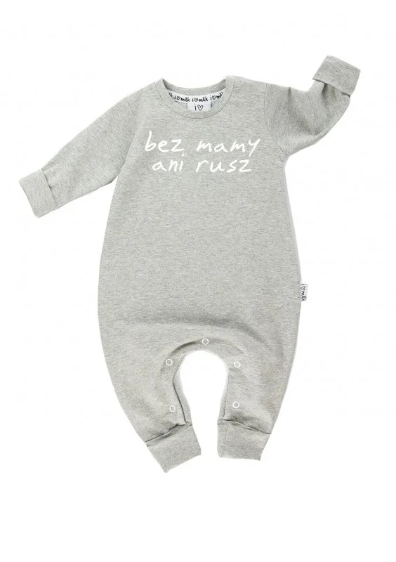 Szary rampers dziecięcy z długim rękawem, z bawełny. Fason ze starannie wykonanym nadrukiem, uszyty w polskiej szwalni.