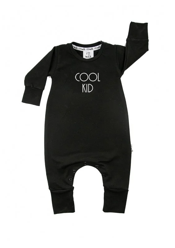 Uniwersalny rampers dziecięcy z miękkiej i wygodnie elastycznej dzianiny bawełnianej. Ubranko w czarnym kolorze, ozdobione trwałym nadrukiem "cool kid".