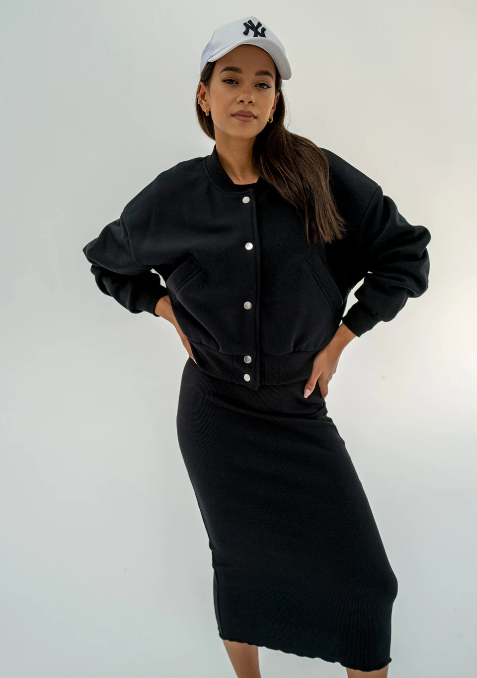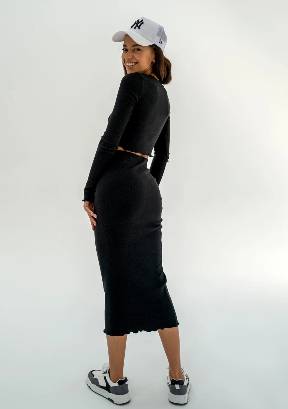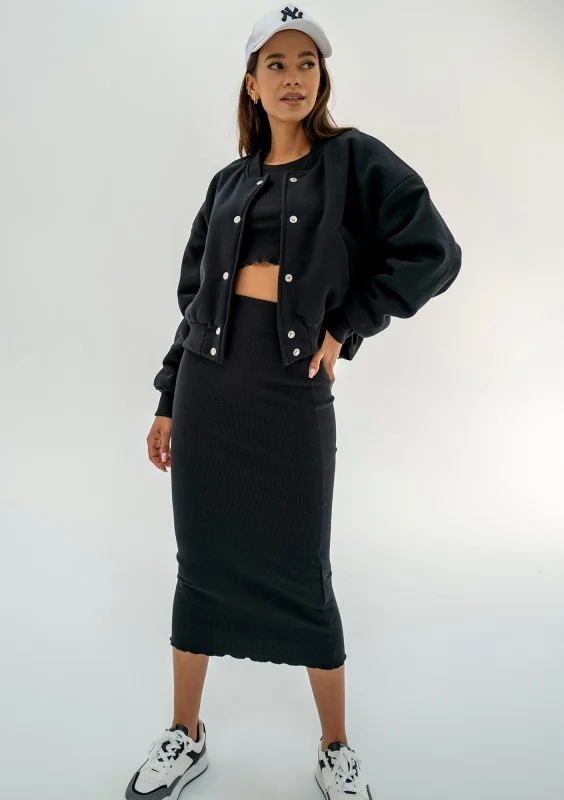 Czarna, dopasowana spódnica midi z prążkowanej dzianiny bawełnianej. Prosty basic, dzięki któremu stworzysz masę różnych stylizacji.
