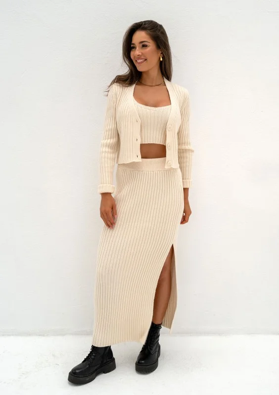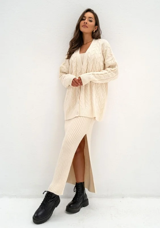 Nasza nowa kolekcja damskich kompletów z dzianiny to propozycja dla kobiet ceniących sobie minimalistyczny styl. Beżowa spódnica maxi z miękkiej włóczki akrylowej to doskonała baza do stworzenia wielu stylizacji. Połącz ją z naszym krótkim topem, kardiganem Celine lub oversizowym kardiganem z ozdobnym splotem. Modelka prezentuje na sobie rozmiar XS/S.