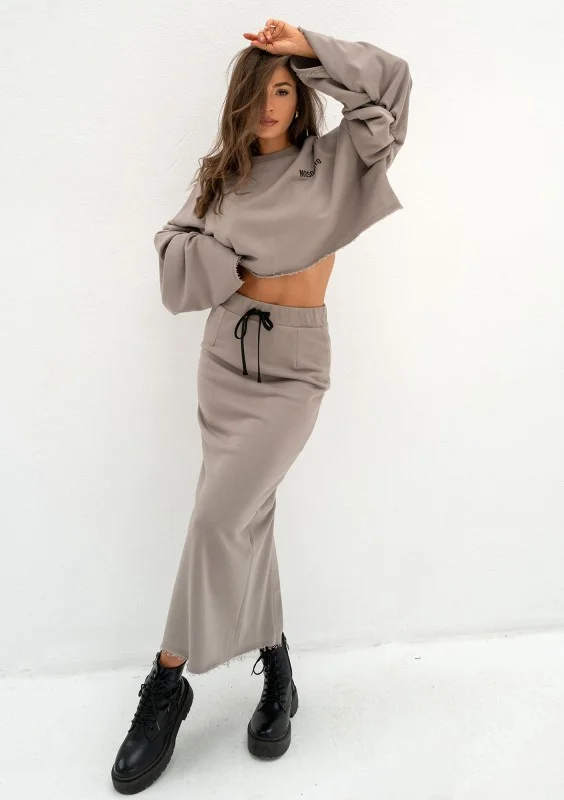 Wygodna spódnica dresowa midi w kolorze taupe. Starannie uszyta z miękkiej dzianiny bawełnianej. Model z gumką i troczkami.
