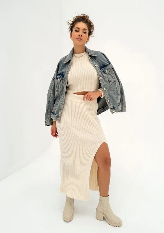 Długa spódnica z rozcięciem, w kolorze jasnobeżowym. Stworzy przytulne i wygodne stylizacje z klasą. Produkt z miękkiej dzianiny w prążki.
