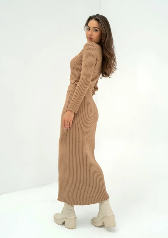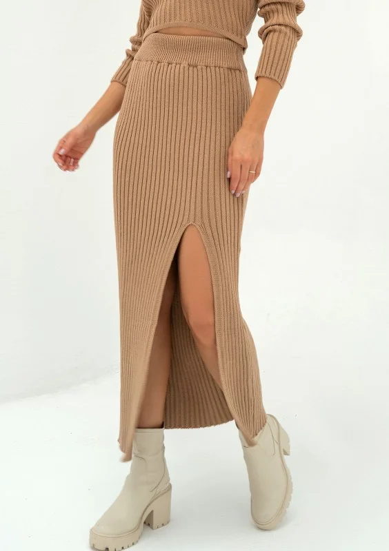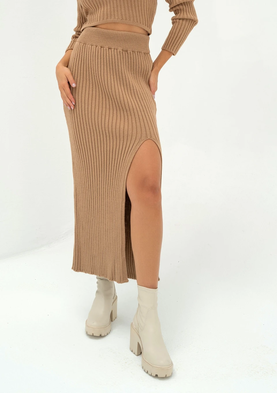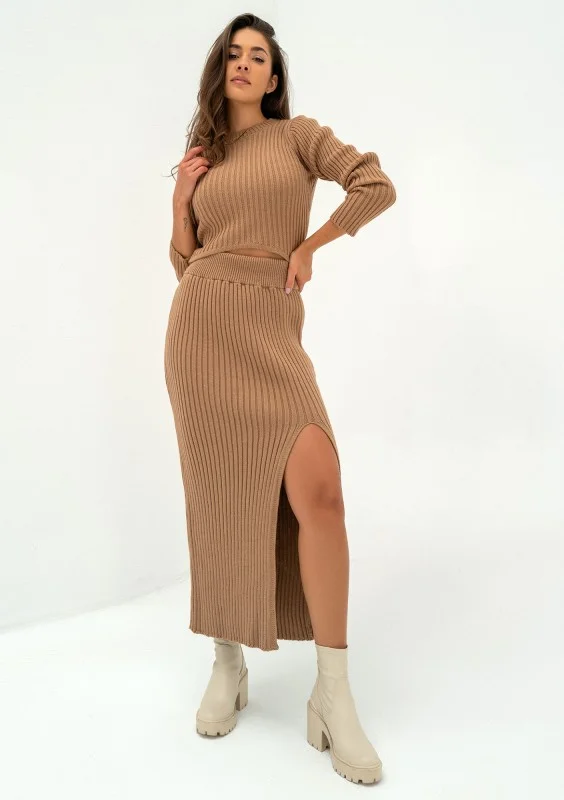 Długa spódnica dzianinowa z efektownym rozcięciem, w kolorze kamelowym. Stworzy przytulne i wygodne stylizacje z klasą.