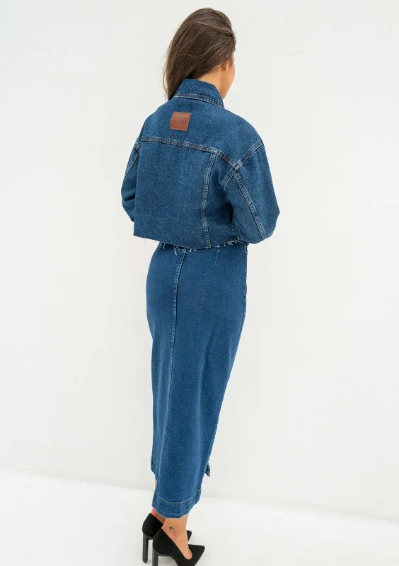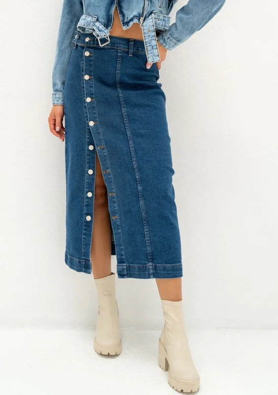 Modna spódnica jeansowa midi, rozpinana po całej długości. Dzięki rozcięciu stanowi wygodny fason dla miłośniczek uniwersalnego denimu.