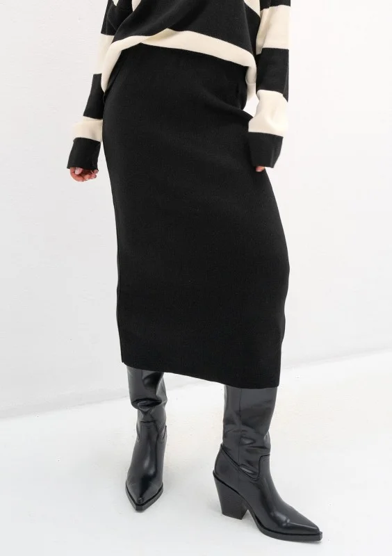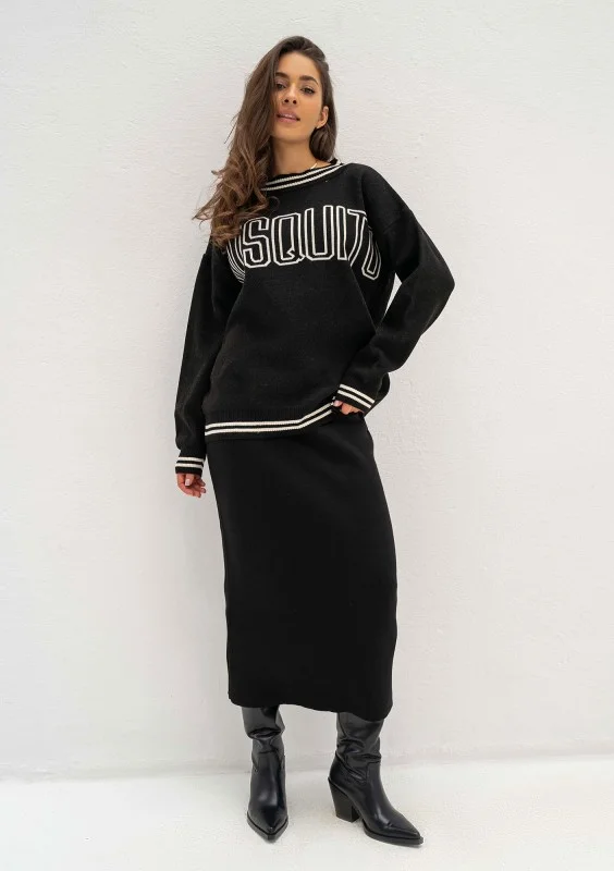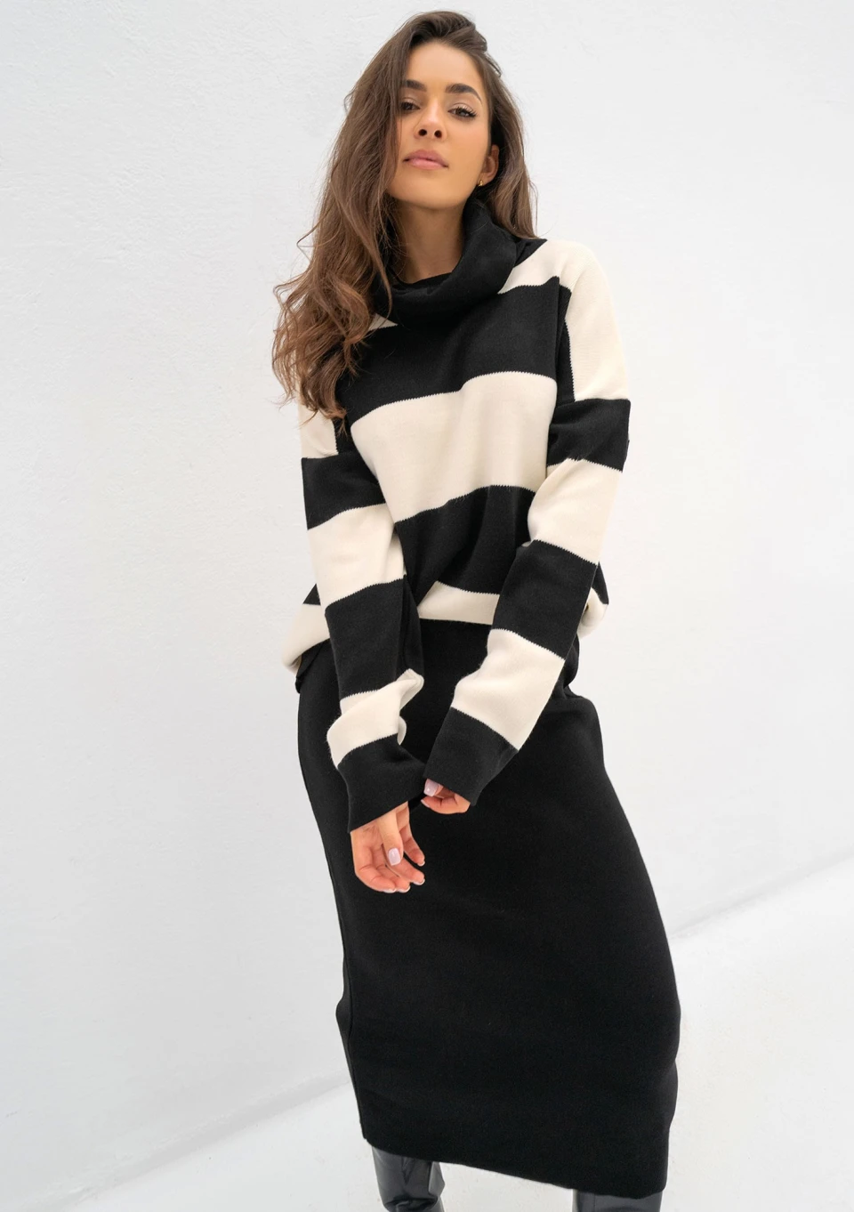 Pożegnaj poranne dylematy! Czarna spódnica damska midi z dzianiny to idealne, bo zawsze ekspresowe rozwiązanie na chłodniejsze dni. Miękka dzianina zapewni Ci nie tylko ciepło, ale także wygodę przez cały dzień. Dopasowany krój i uniwersalna gładkość koloru sprawiają, że ten zestaw jest niezwykle praktyczny i pasuje do wielu okazji, jak i pozostałych elementów stylizacji. Modelka prezentuje na sobie dedykowany, wykonany z tego samego materiału sweter Mishy.