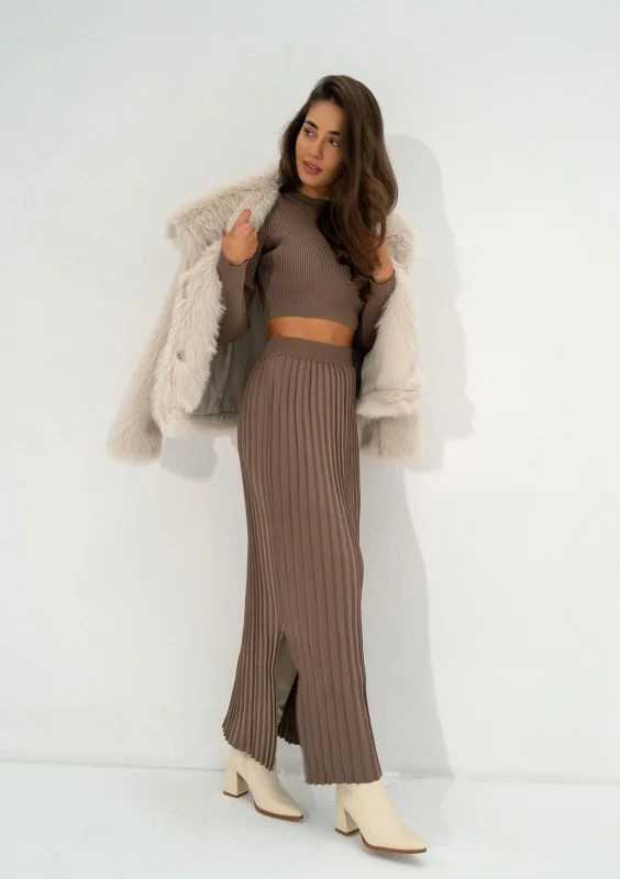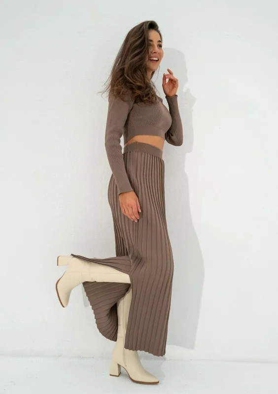 Wygodna spódnica midi o wszechstronnym zastosowaniu w chłodniejszym sezonie. Wykonana w uniwersalnym, kawowym odcieniu. Miękka dzianina tworzy eleganckie plisy.