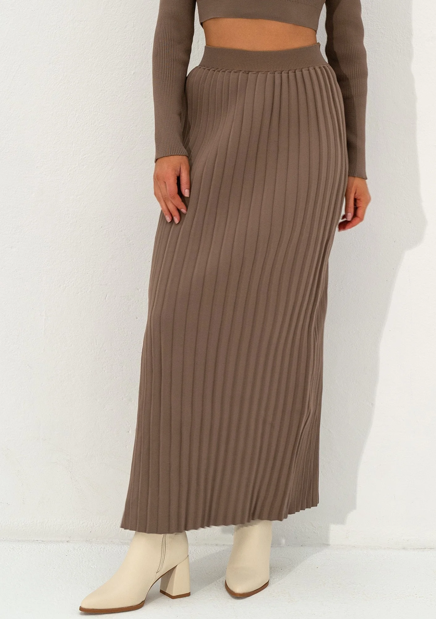 Spódnica midi z plisami to wyjątkowa propozycja na chłodniejsze dni. Zazwyczaj kojarzymy plisowane spódnice z wiosennymi stylizacjami, jednak ten model, wykonany z grubszej dzianiny, idealnie wpisuje się w jesienno-zimową garderobę. Elegancki, kawowy brąz i subtelne plisy tworzą ponadczasowy duet, który doda szyku na różne codzienne wyjścia i spotkania.