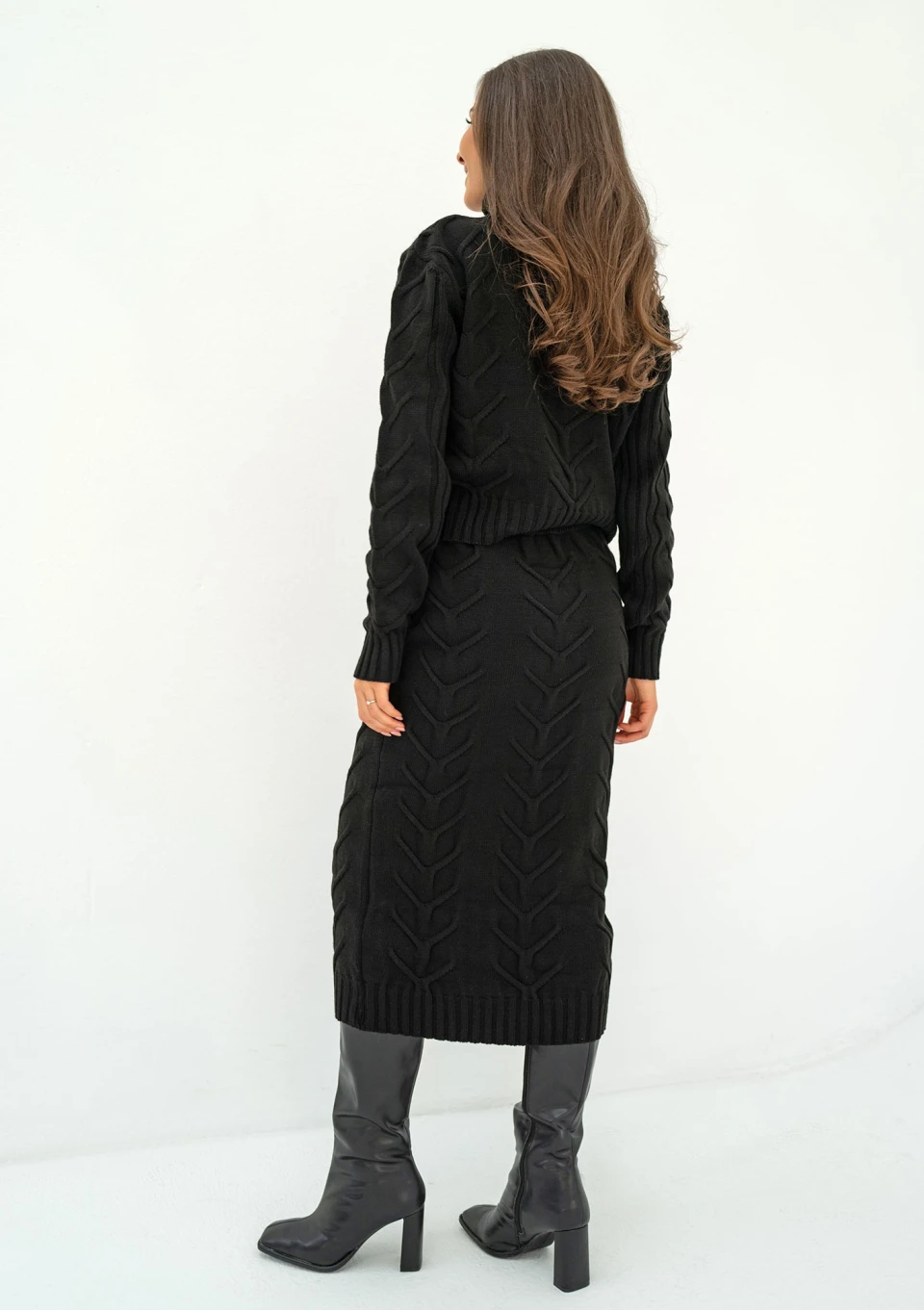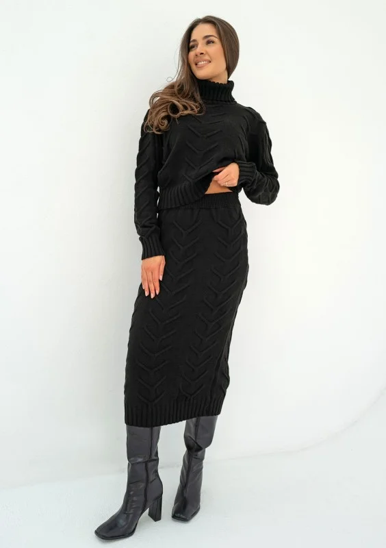 Czarna spódnica dzianinowa midi z pięknym splotem, wykończona prążkowanym ściągaczem. Model z miękkiej włóczki akrylowej.
