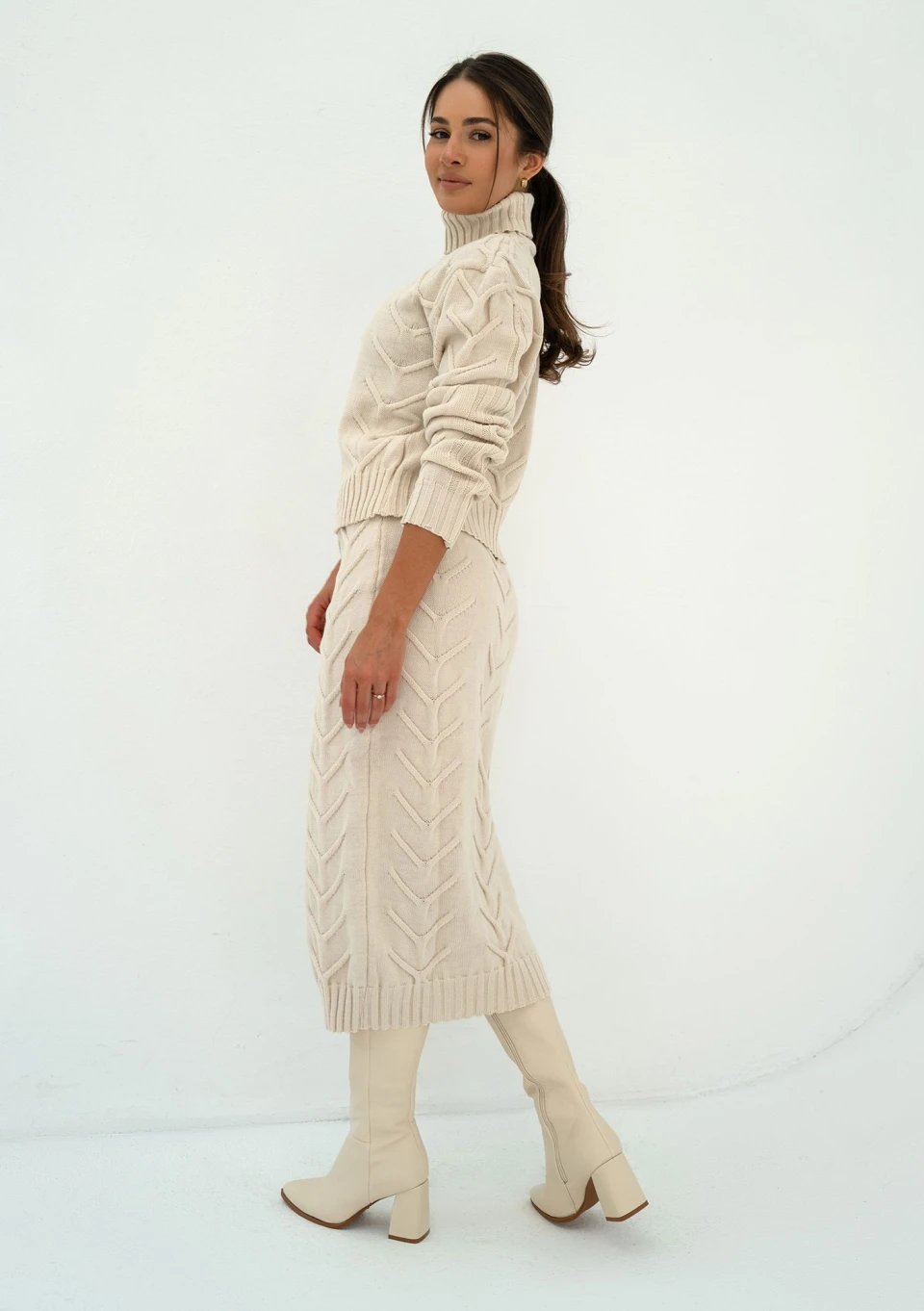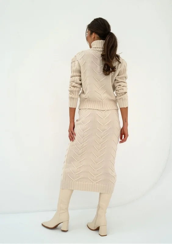 Spódnica dzianinowa midi z pięknym splotem, wykończona prążkowanym ściągaczem. Model z miękkiej włóczki akrylowej, w odcieniu ecru.