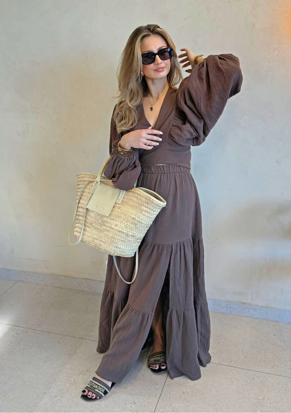 Z tą długą, brązową spódnicą stworzenie letniej stylizacji stanie się dziecinnie proste. Nie ograniczaj się do proponowanej kopertowej koszuli – śmiało zestawiaj ją z krótkimi topami, seksownymi braletkami, a nawet górą od kostiumu kąpielowego, gdy upał daje się we znaki. Możemy Ci zagwarantować jedno: ta spódnica szybko zagości na stałe w Twojej szafie i będziesz po nią sięgać bez zastanowienia. To idealny wybór na wakacyjne wyjazdy, ale równie dobrze sprawdzi się na co dzień, stając się stylowYm elementem Twojego outfitu do pracy w upalne dni.