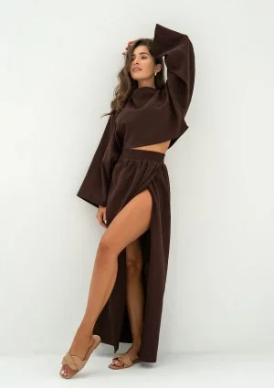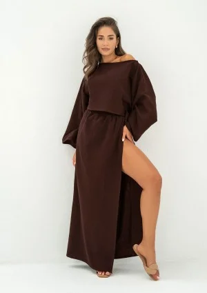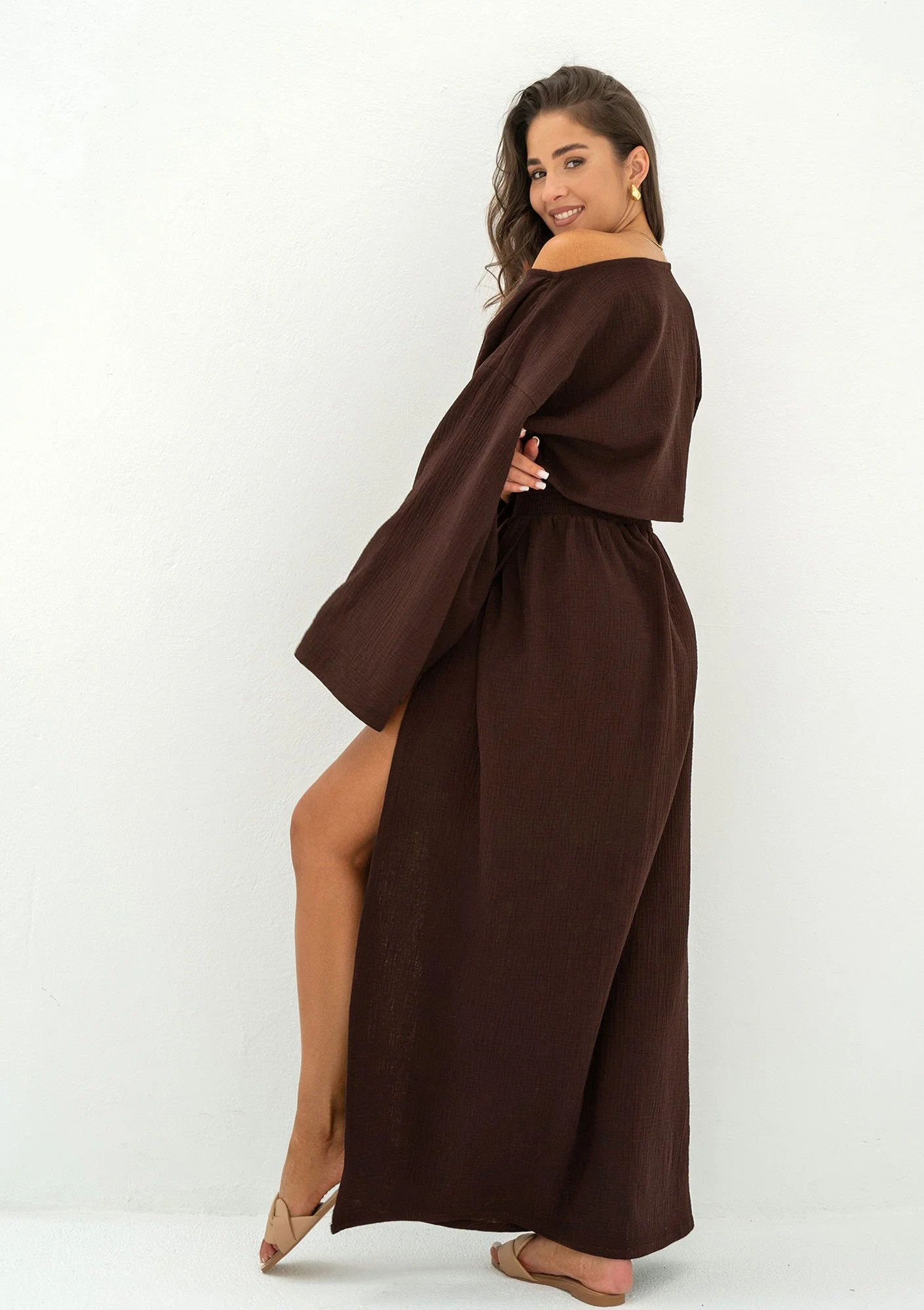Letni look dyktuje Twoje plany, ale poczucie komfortu jest zawsze najważniejsze! W upalne dni postaw na muślinowe ubrania damskie, które otulą Cię przewiewnym i pełnym lekkości włóknem. Wyobraź sobie długą, bawełnianą spódnicę z rozcięciem, która przy każdym kroku subtelnie odsłania nogi i emanuje ponadczasowym stylem boho. To idealny wybór na niezobowiązujące spotkania, letnie przyjęcia w ogrodzie czy beztroskie chwile podczas wakacji w słonecznym raju. Ten model z pewnością skradnie serce minimalistek, które cenią sobie uniwersalność i naturalną paletę barw. Uszyliśmy ją z materiału w kolorze brązowym, który cudownie podkreśli urodę i letnią opaleniznę.