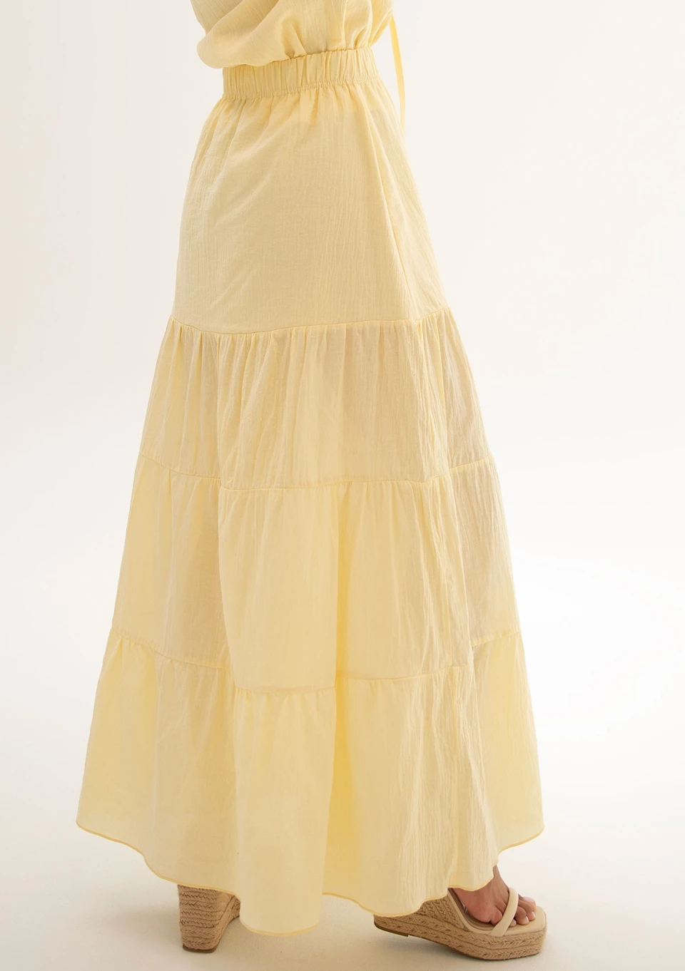 Zwiewna, letnia spódnica damska maxi w stylu boho, z cienkiej tkaniny bawełnianej. Fason z przeszyciami, w jasnożółtym odcieniu.
