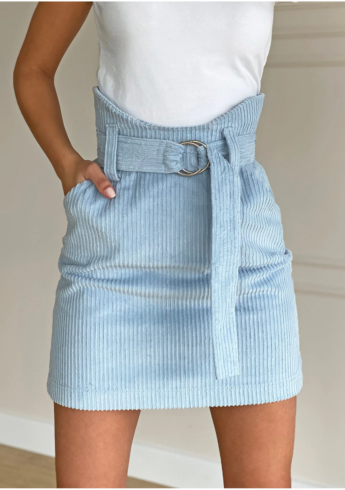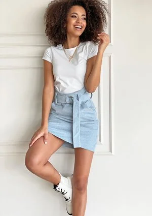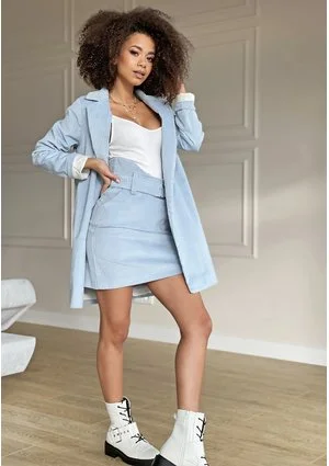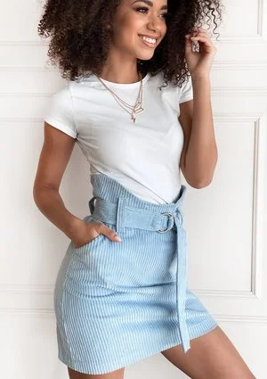 Krótka, sztruksowa spódniczka w pięknym, błękitnym kolorze widoczna na zdjęciu to jeden z unikatowych modeli zaprojektowanych specjalnie dla marki Mosquito przez Alicję Komar - model o długości mini został uszyty w Polsce z wysokogatunkowego zamszu, który perfekcyjnie dopasowuje się do kształtu sylwetki i skutecznie ukrywa wszelkie mankamenty figury. Spódnica pięknie podkreśla wcięcie w talii - wszystko to za sprawą odpowiednio wyprofilowanego wycięcia u góry i modnego paska, który możesz nosić na kilka sposobów.