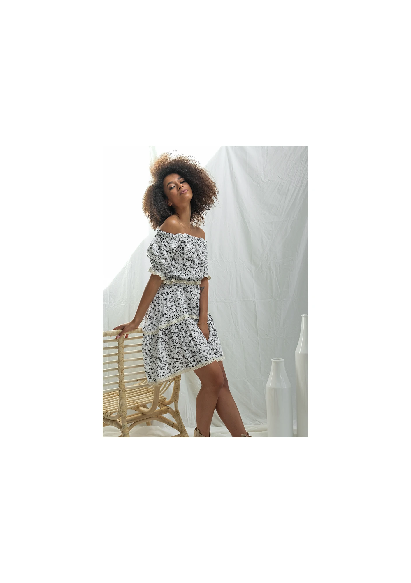 Urocza damska spódnica opada wzdłuż sylwetki, tworząc zwiewne fale. Te poruszają się przy każdym kroku, jednak nie odsłaniają nadmiernie nóg. Odzież sięga swoją długością przed kolano, gdzie znajduje się wykończenie kremową koronką. Spódnica może być komponowana do stylizacji codziennych lub specjalnych - z odpowiednimi dodatkami sprawdzi się bowiem jako ubranie na imprezę rodzinną, taką jak chrzest, komunia, czy poprawiny. Można do niej dobierać zarówno delikatne buty na płaskiej podeszwie, jak i nieco odważniejsze obcasy, a nawet botki w kremowych odcieniach. W razie potrzeby, spódnica może być prana w pralce. Tkanina jest wytrzymała i odporna na spieranie, dlatego jej wzór wygląda jak nowy nawet na wiele tygodni po zakupie. Odzież szyta w Polsce. Za jej projekt odpowiedzialna jest designerka Alicja Komar.