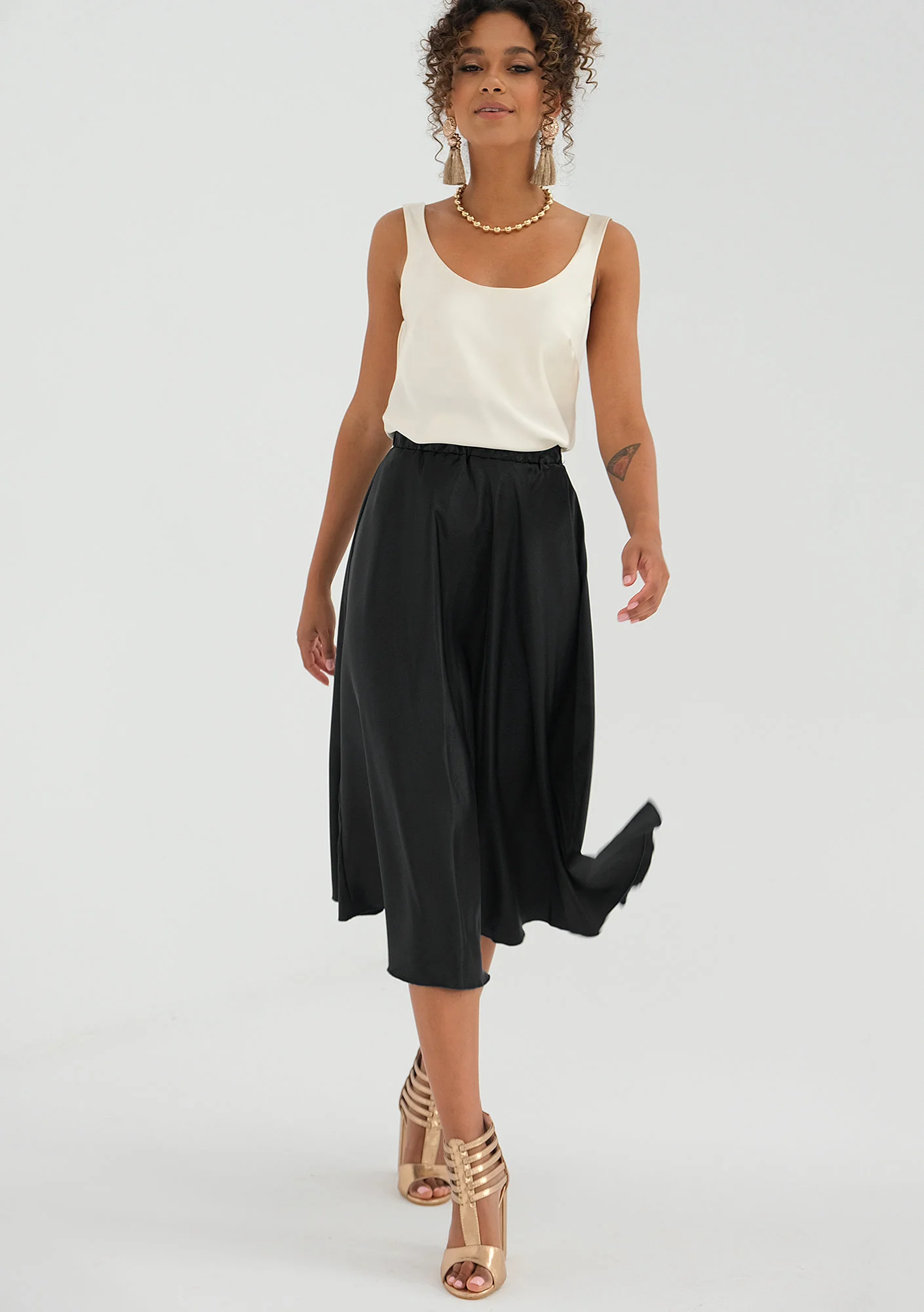 Skompletuj swą szafę na jesień – niech nie zabraknie w niej lekkiej i uniwersalnej spódnicy, z którą zbudujesz codzienne stylizacje. Czarna spódnica z satyny sięga długością za kolano. Na całym obwodzie posiada jednolitą długość. Jej fason jest odrobinę rozkloszowany, dlatego świetnie wpisze się również w stylistykę vintage. Ubranie szyjemy w Polsce, w rozmiarach XS, S, M i L. Spódnica satynowa jest bardzo komfortowa w noszeniu, a to za sprawą wygodnej, elastycznej gumy w pasie. Materiał jest bardzo lekki, zwiewny i delikatnie śliski oraz pięknie odbija światło.