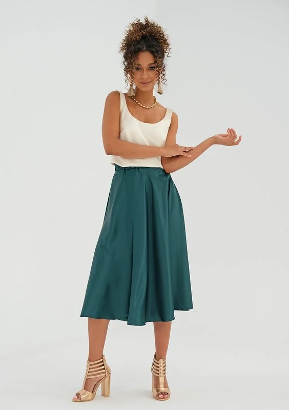Rozkloszowana spódnica midi w odcieniu ciemnej zieleni. Model bardzo elegancki, z gładkiej tkaniny o satynowym połysku włókien. Idealna do klasycznych koszul i topów.