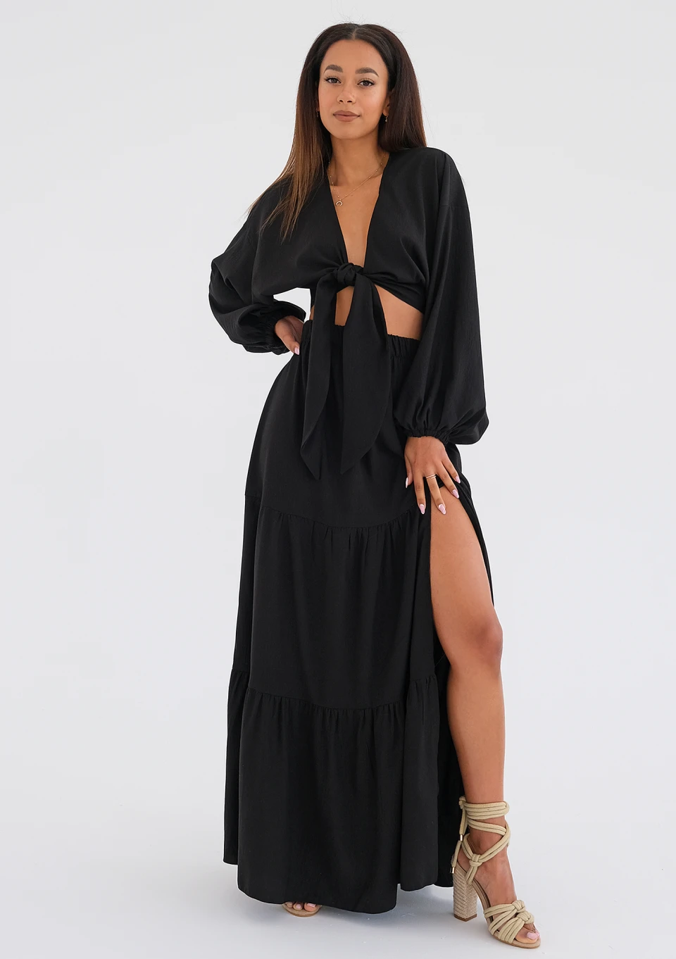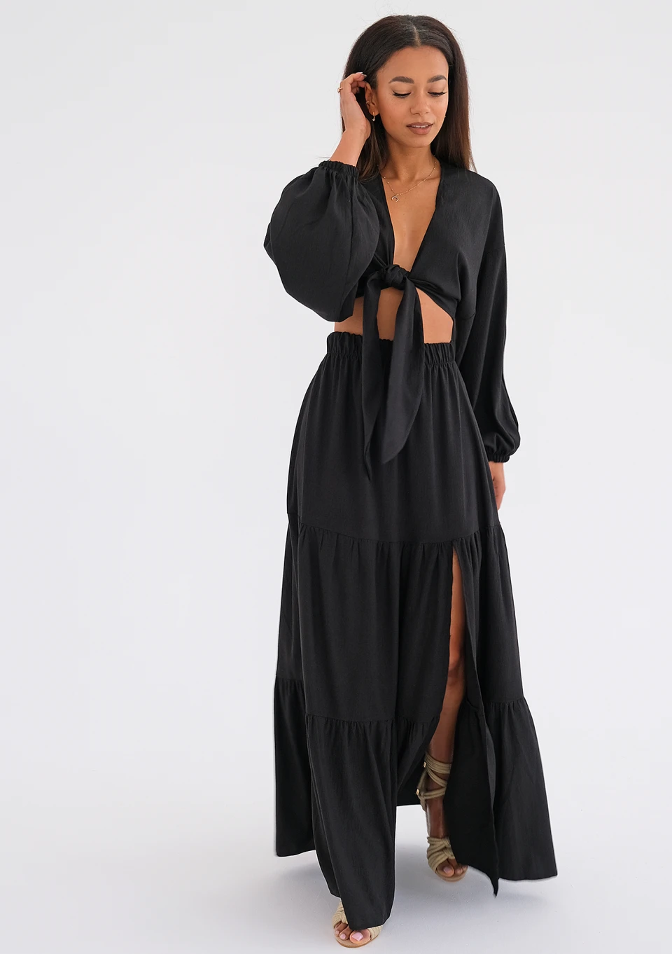Czarna spódnica maxi dopełni wakacyjnego stylu wielu kombinacji. To model wygodnie zwiewny i luźny, urozmaicony przeszyciami i zmysłowym rozcięciem.