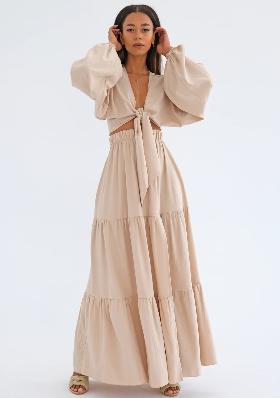 Długa, beżowa spódnica z rozcięciem stworzy efektowne, letnie komplety w stylu boho. Zestawiona z prostymi dodatkami jest równie odpowiednia na co dzień, co na wieczór.