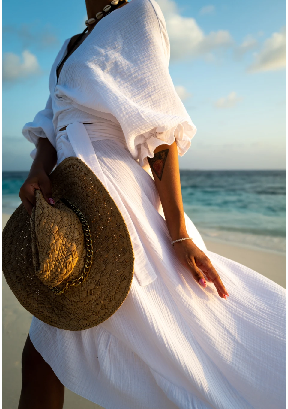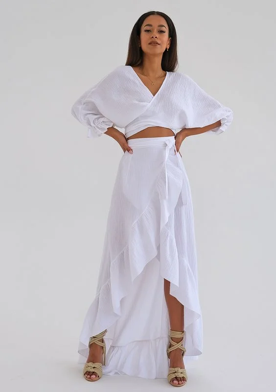 Biała spódnica boho w kunsztownej formie maxi. Model zapewnia czarującą lekkość dzięki asymetrii kopertowego układu, falbance i wiązaniu w pasie. Zmysłowości i plażowego stylu nadaje muślinowa faktura zwiewnej, bawełnianej tkaniny.