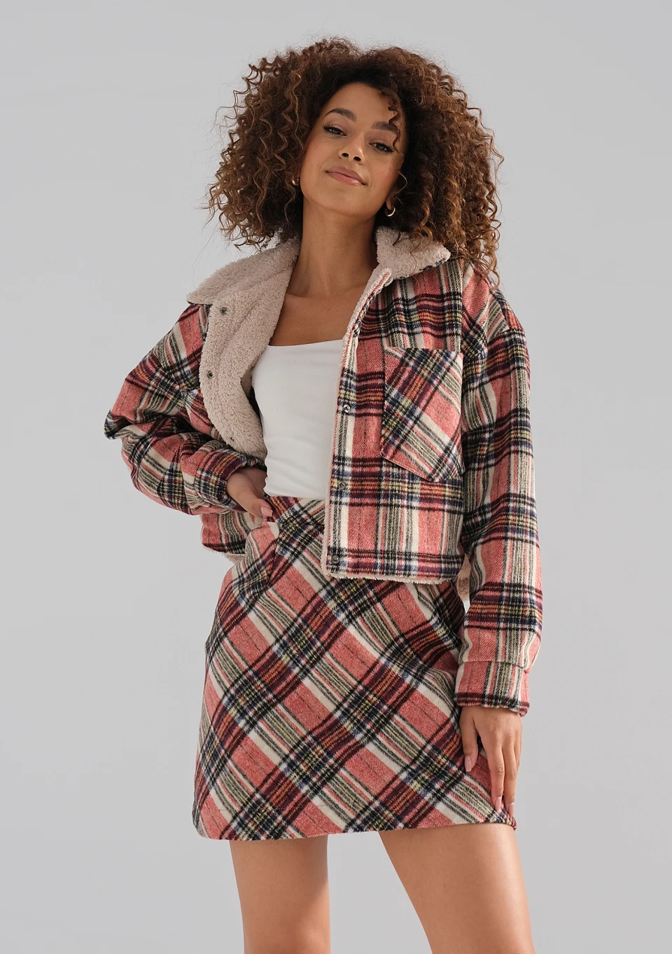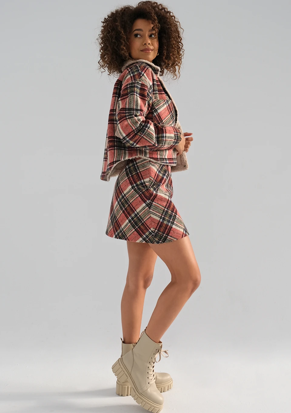 Modna spódniczka ołówkowa mini zdobiona czerwoną kratą świetnie podkreśla sylwetkę i pasuje do codziennych, bardzo kobiecych stylizacji. To model wykonany z miękkiej flaneli.