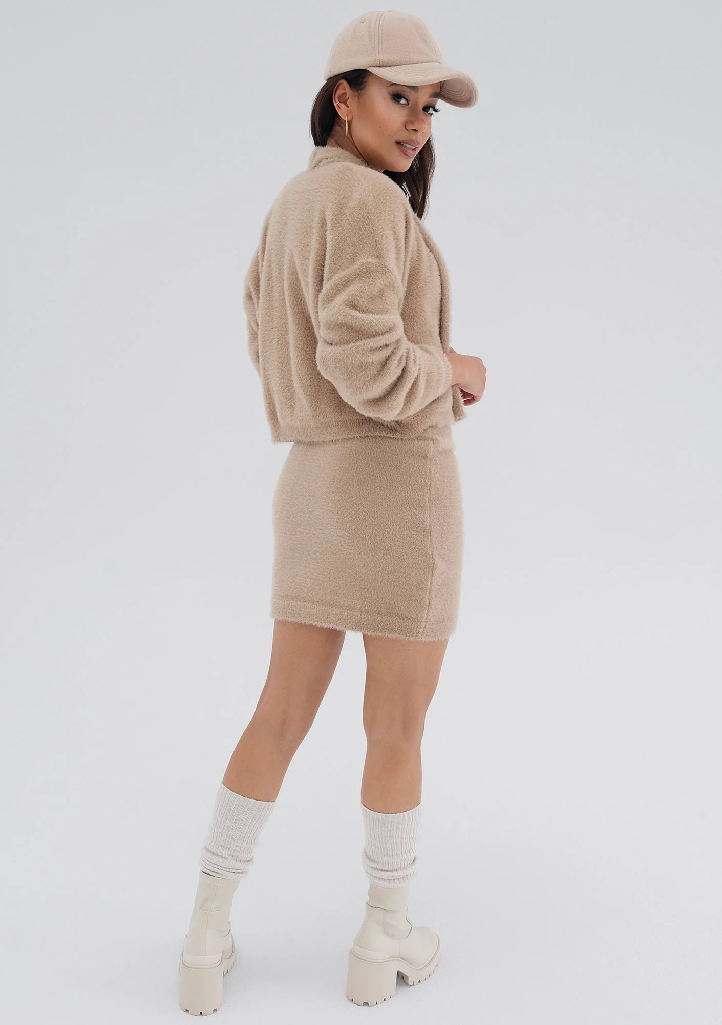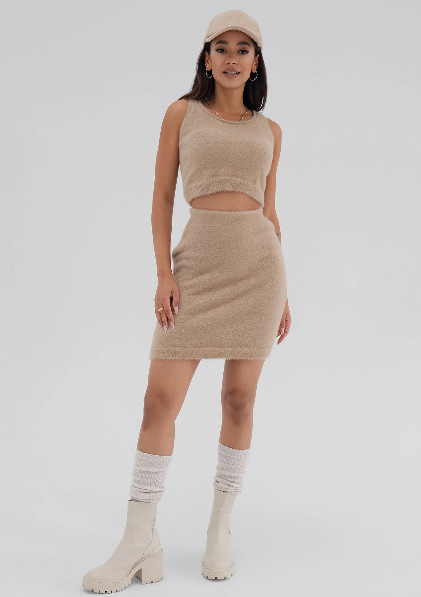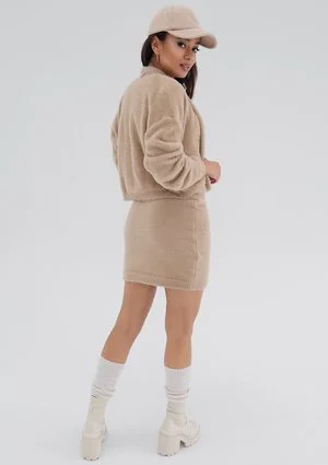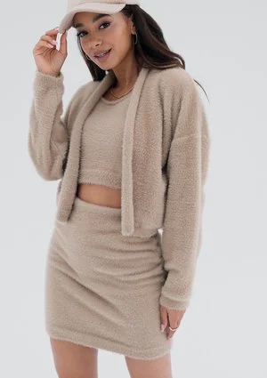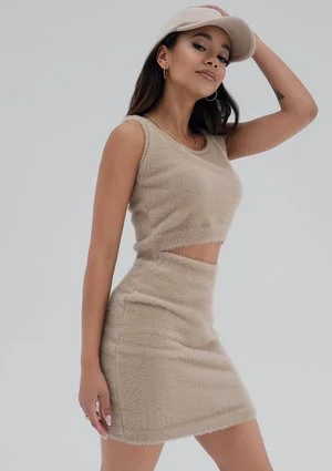 W takiej stylizacji będziesz wyglądać subtelnie i kobieco. Beżowa spódniczka mini z miękkiego materiału posiada wygodny, dopasowany do sylwetki fason, dzięki któremu podkreśla walory. To uniwersalny model na elastycznej gumce, wykonany w popularnych rozmiarach XS – L. Propozycją projektantki Alicji Komar jest efektowny komplet, który stworzysz wybierając do spódniczki krótki top oraz kardigan.