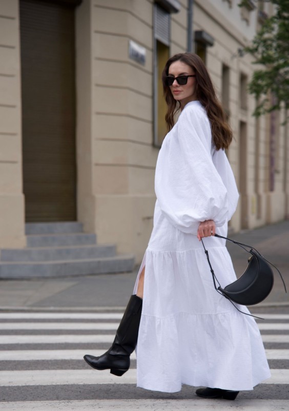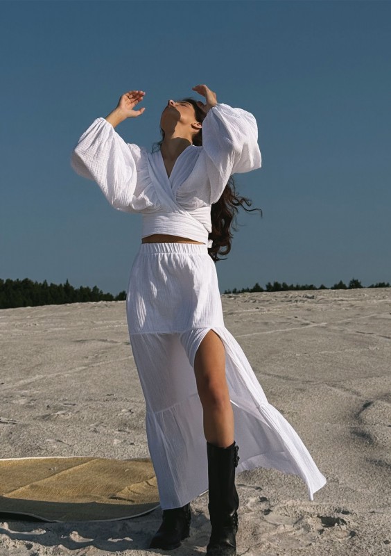Biała spódnica maxi z muślinu - kwintesencja stylu boho, wakacji i wygody. To obowiązkowa pozycja w Twojej szafie na letnie upały! Idealnie pasuje do kopertowej koszuli Capri.