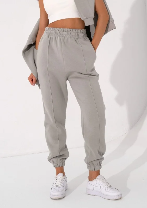 Nasze spodnie dresowe Easy to stylowy sposób na wygodę! Mają sportowy, luźny krój z kieszeniami i gumkami w nogawkach. Model w szarym kolorze.