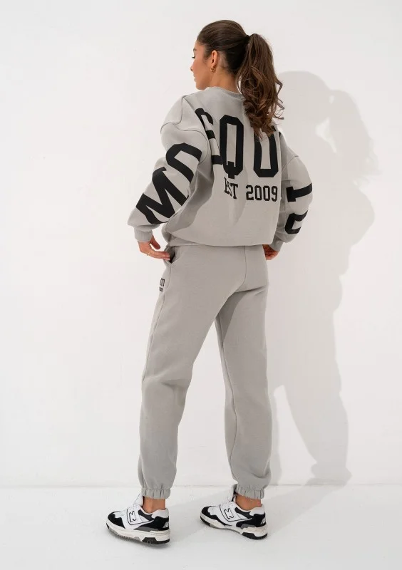 Ten fason dresu wygląda świetnie na każdej sylwetce! To luźne spodnie dresowe damskie, wyposażone w bardzo wygodną, szeroką gumkę i dodatkowe troczki do zawiązania. Mają piękny, gładki odcień szarości, który pasuje do każdego stylu i różnych dodatków. Design świetnie uzupełnia dedykowaną bluzę Duve, która również została podkreślona czarnym logotypem. Dres ozdabia akcent daty założenia naszej marki, co dodaje bardzo stylowego efektu. W składzie materiału tych wygodnych spodni znajdziesz niemalże wyłącznie naturalną bawełnę! Dla lepszej jakości i wygody, a także łatwej pielęgnacji i trwałości włókien, zostały wzbogacone drobną domieszką poliestru i elastanu.