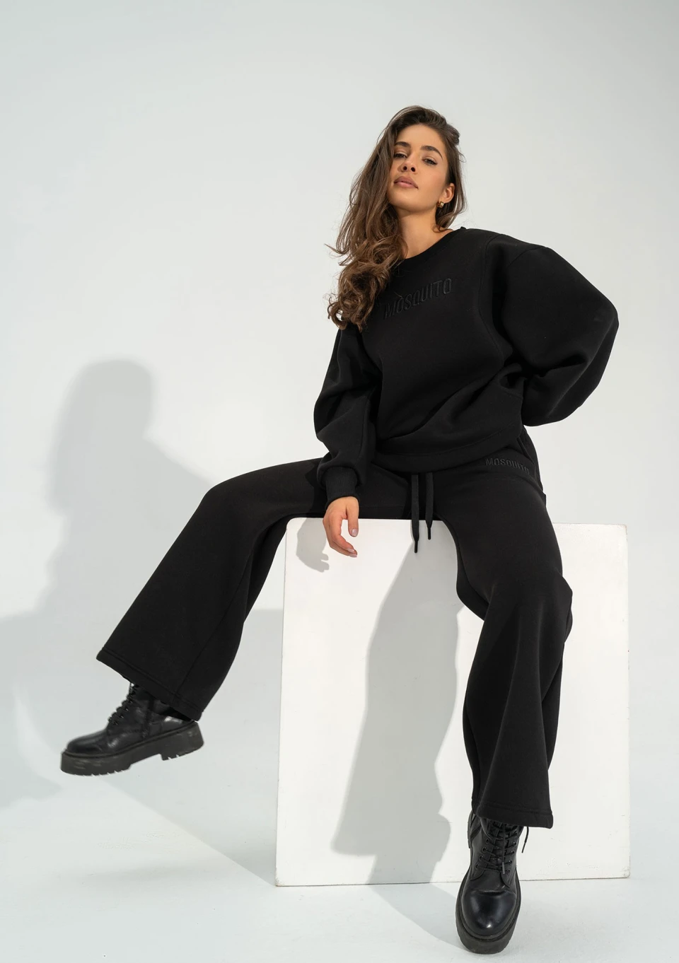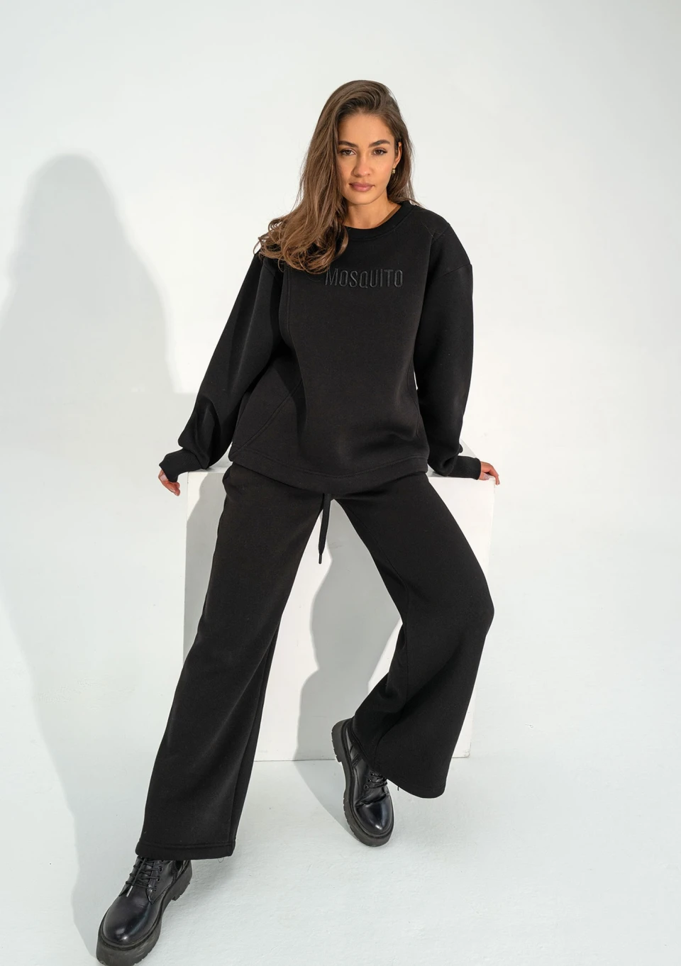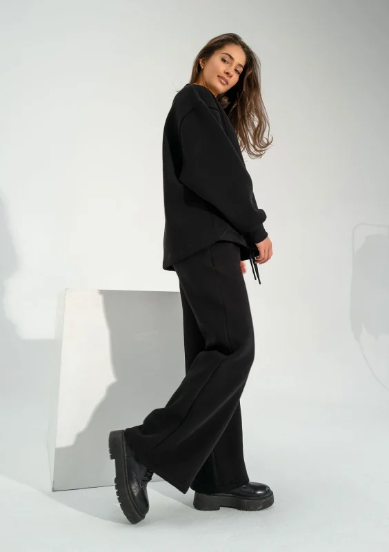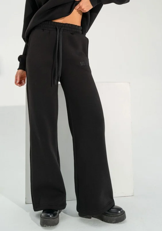 Czarne spodnie dresowe damskie, z wygodną nogawką o szerokim kroju. Dopełnione pięknym, haftowanym logiem.