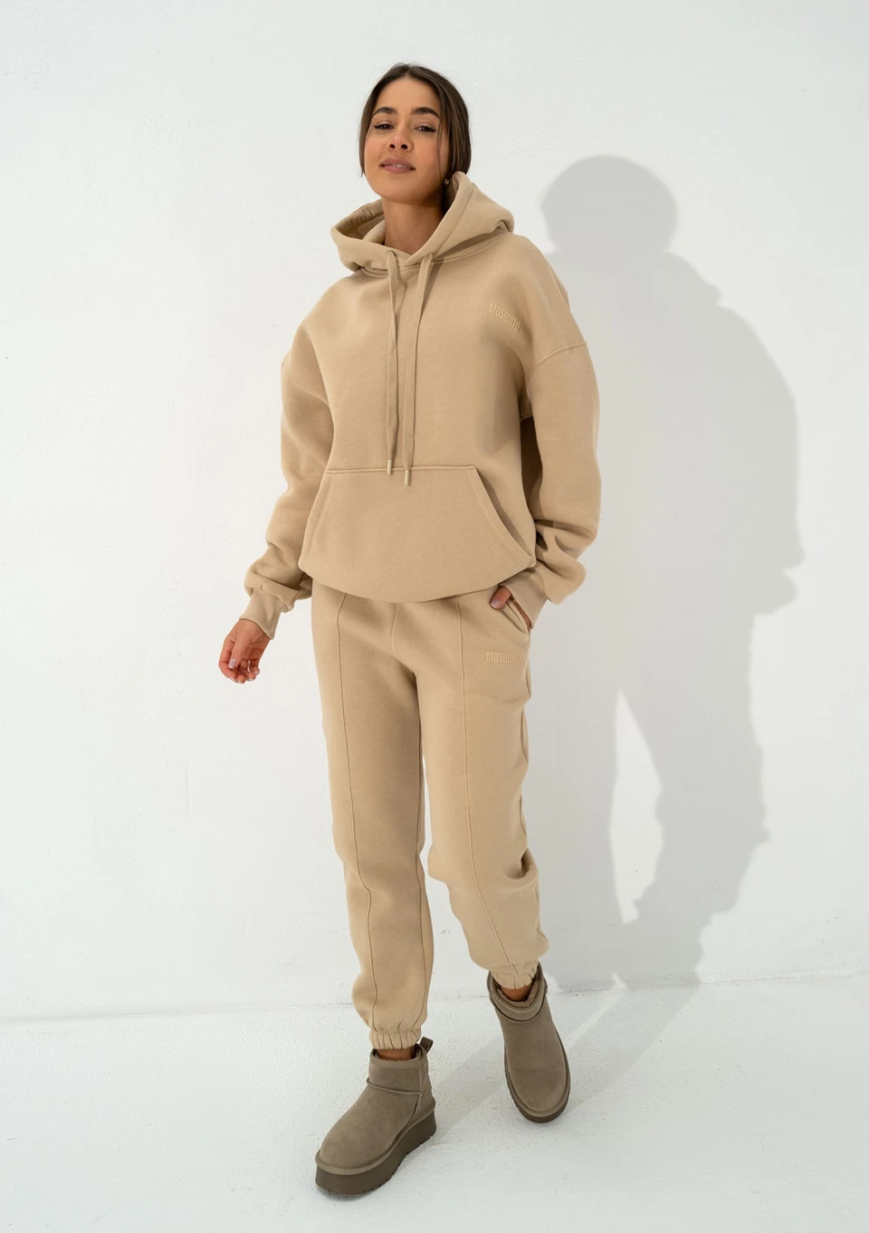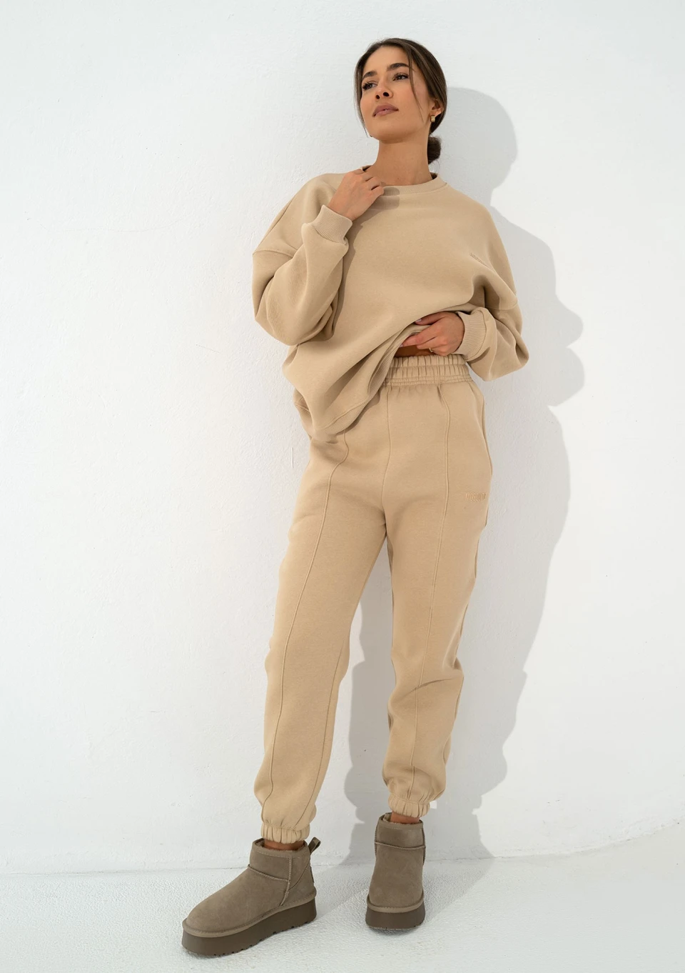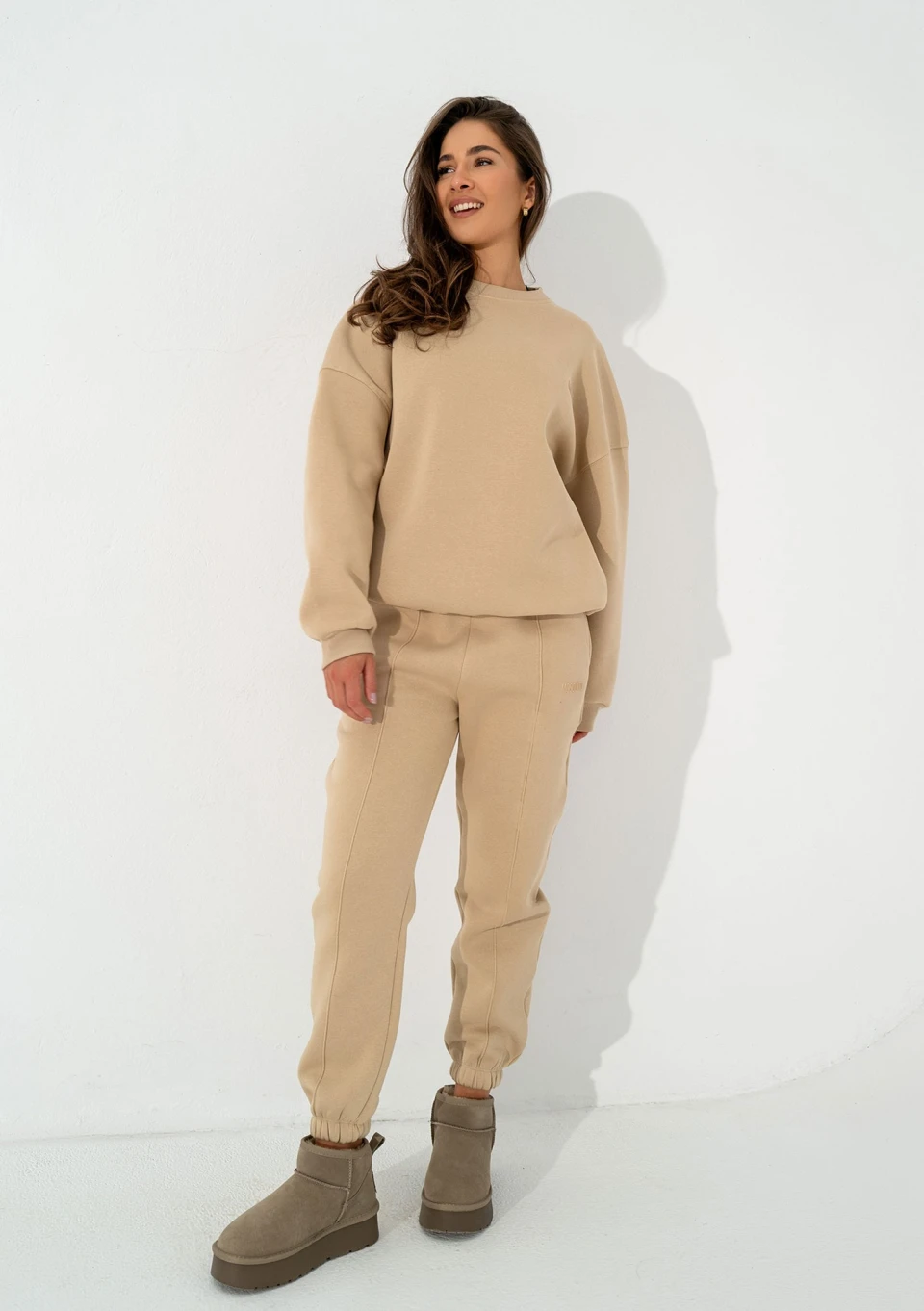 Beżowe spodnie dresowe Easy mają bardzo luźny stan oraz pogłębiony krok, dzięki temu świetnie prezentują się na pełniejszych kształtach. Na smukłej sylwetce na biodrach będą układały się w bardzo oversizowym stylu. Zostały wzbogacone dodatkowymi szwami na nogawkach, które nadają małej elegancji. Dres możesz połączyć z różnymi bluzami z tego samego materiału, m. in. Easy, Calm, Glee lub Boosh.