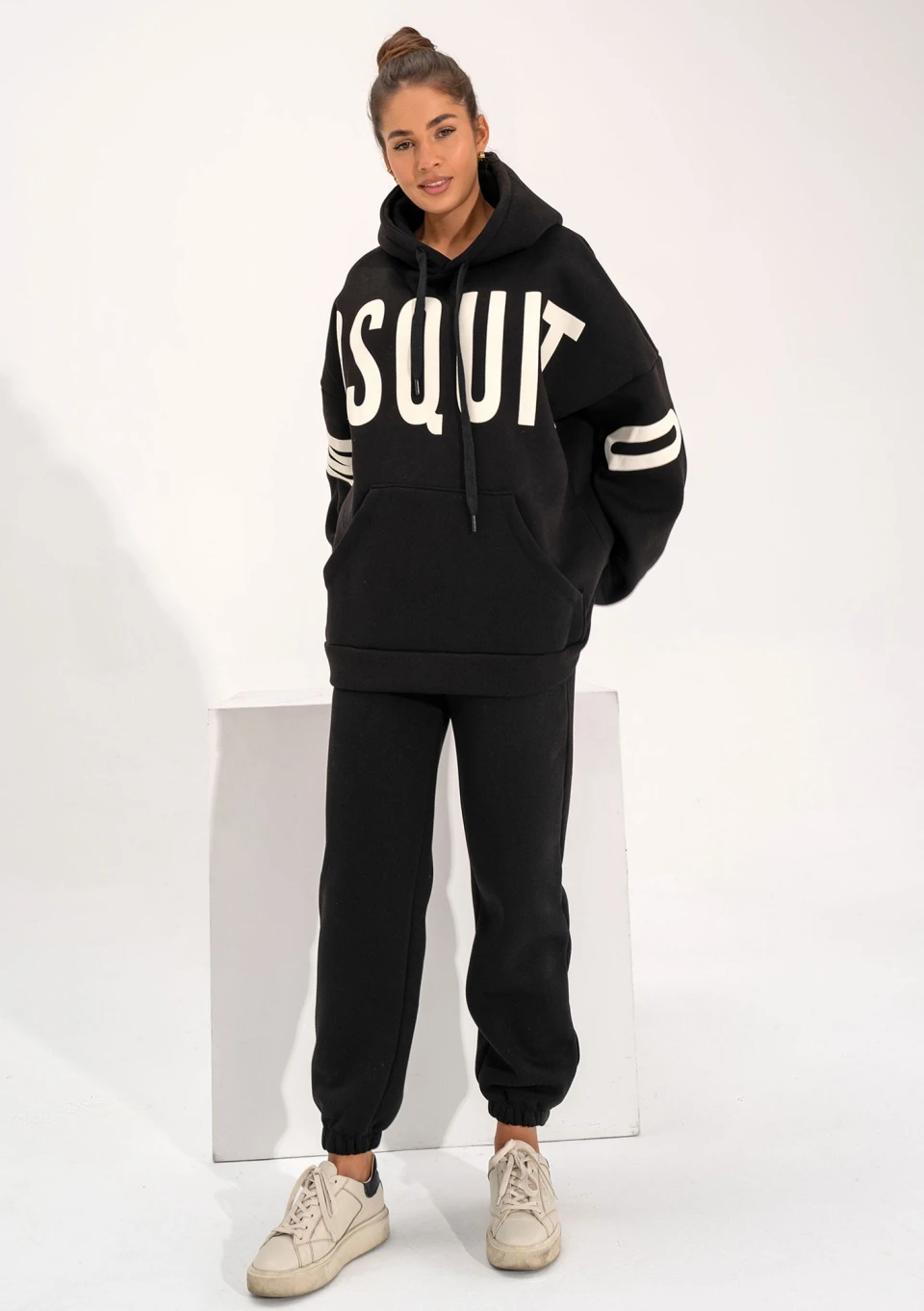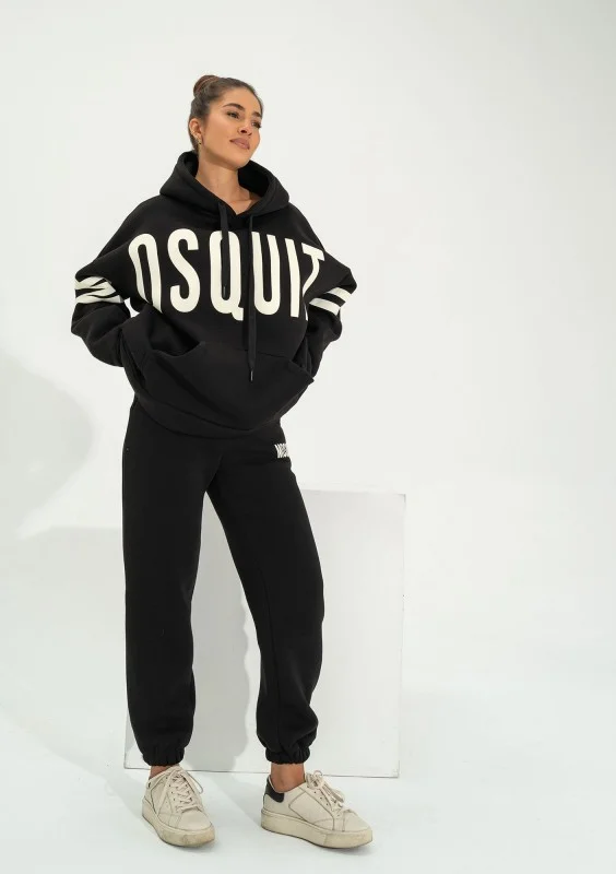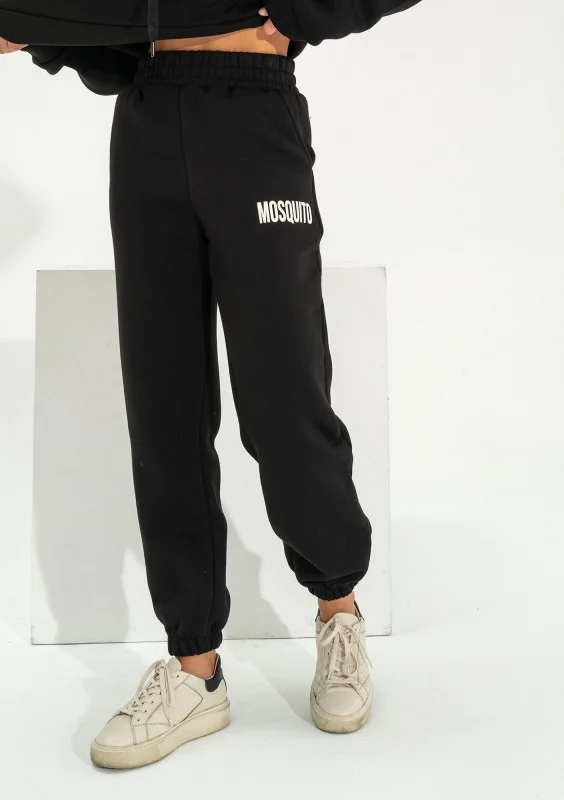 Czarne spodnie dresowe oversize, w mocno sportowym stylu. Wyróżniają się miękką dzianiną bawełnianą i wyrazistym logiem Mosquito.