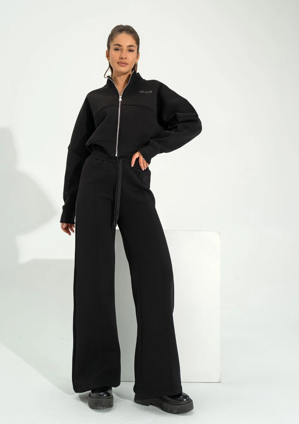 Oto zupełnie nowy design w naszym Mosquito! Te stylowe, czarne spodnie dresowe damskie posiadają doskonały materiał, który świetnie sprawdzi się w chłodniejszym okresie przejściowym. Włókna tworzą miękki, ciepły puszek od spodu, który umili Ci każdą chwilę. Wygoda przede wszystkim! Ten klasyk wzbogaciliśmy wygodną, szeroką gumą z troczkami do zawiązania. Design zwieńczają ozdobne, podłużne szwy, wprowadzające minimalny kant. Stwórz komplet z rozpinaną bluzą Bailee, wykonaną z tej samej dzianiny bawełnianej.