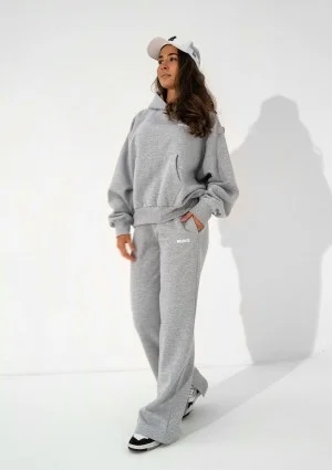 Szare spodnie dresowe w jasnym, melanżowym odcieniu mają wyjątkowy design. Luźne nogawki są modnie rozcięte, co nadaje im bardzo swobodnego i nieoczywistego stylu. Model Levi został zaprojektowany z myślą o wyższych kobietach, którym trudno jest znaleźć dresy damskie o odpowiedniej dla nich długości nogawek. Modelka Andżelika ma 167 cm wzrostu i prezentuje na sobie rozmiar S.